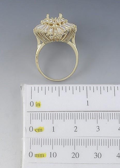 There are 16 round, modern brilliant cut diamonds around the center and 28 baguette diamonds set around the outer circle of design. The round diamonds are VS-1 or higher clarity and G-H color, while the baguette stones are VVS-2 to VS-1 clarity and H color. There is at least 2 carats of total diamond