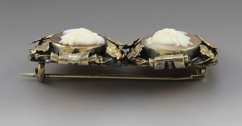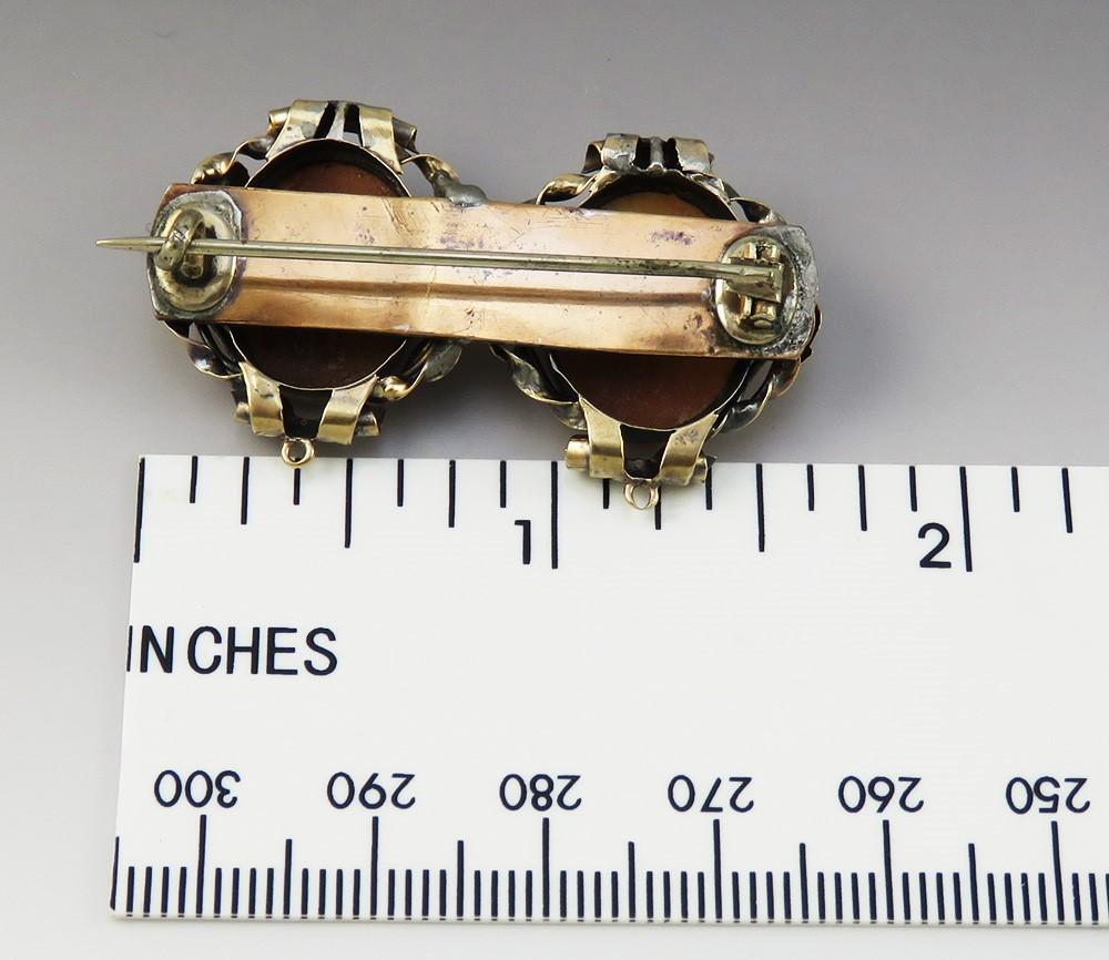 Gorgeous c1870s Victorian 14k Gold Carved Double Cameo Muses Women Brooch Pin