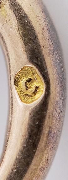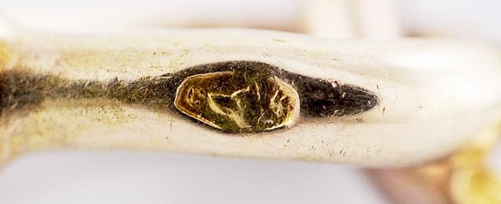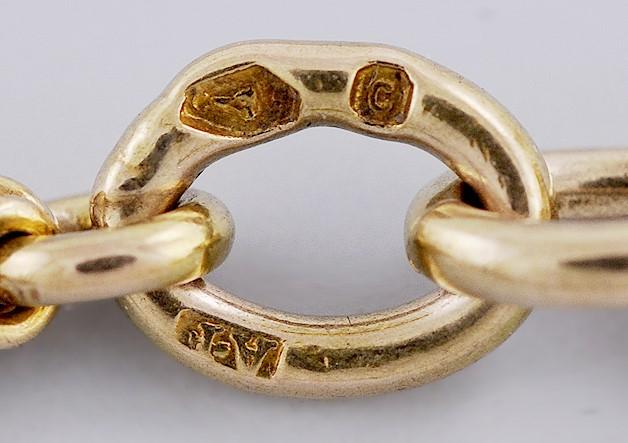 This piece is hallmarked on the link next to the lobster claw style clasp with the Austrian dog's head mark for 14 karat gold, a maker's mark of AF, and the assay city mark of C for Prague. The lobster clasp has the maker's mark AF. The springring clasp and the slider both have the C assay mark. The maker's mark AF and the dog's head 14 karat gold guarantee are on the link next to the springring clasp. This piece is clearly all original.