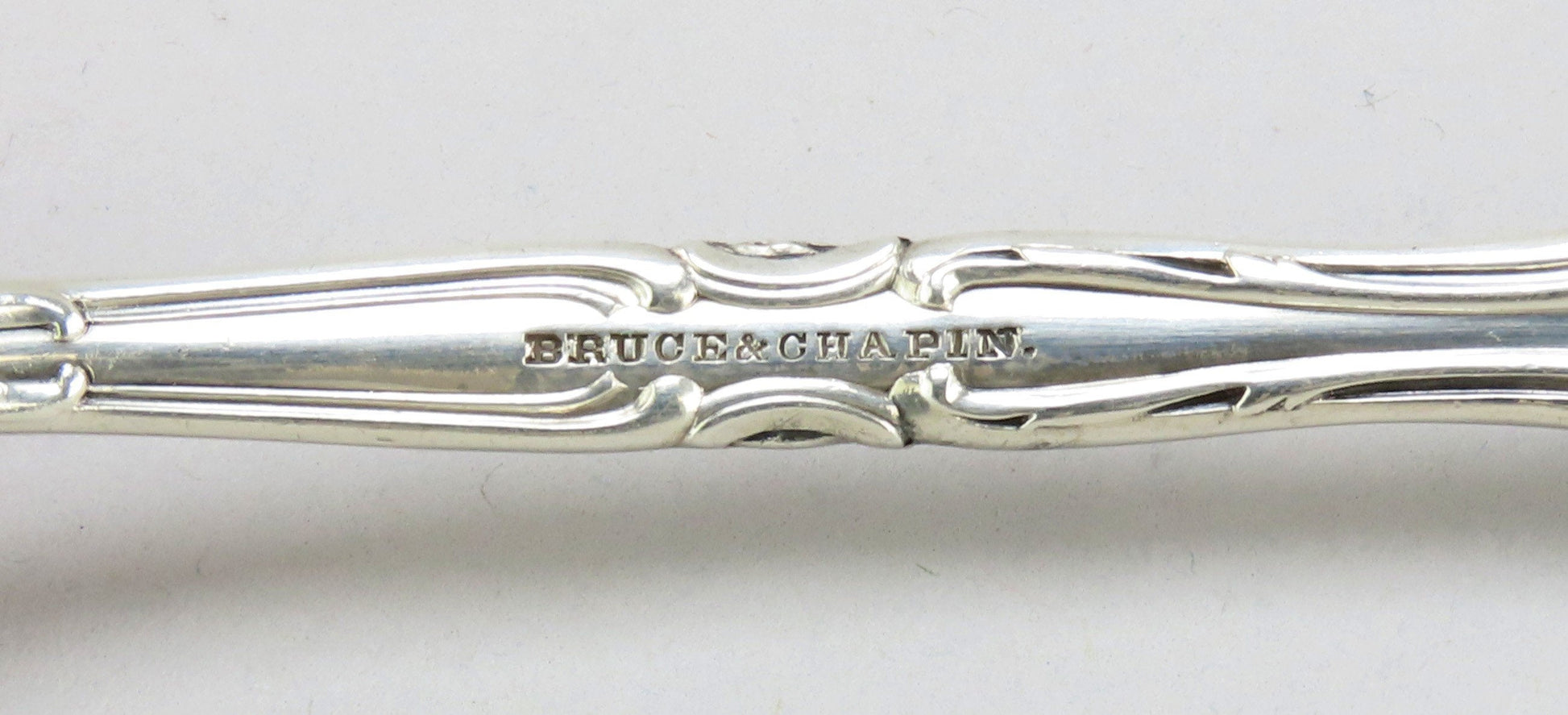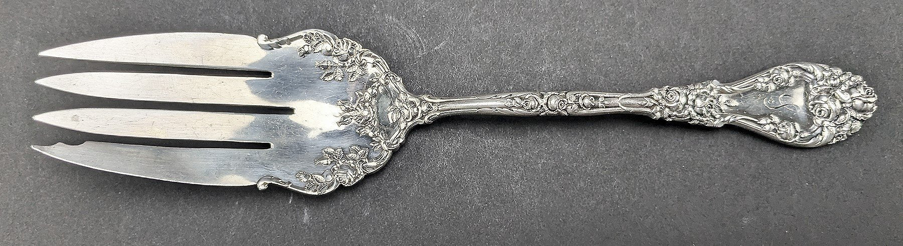 Presented is a gorgeous sterling silver serving serving fork from Durgin. This piece is in the Marechal Niel pattern which was patented in 1896. The pattern displays beautiful roses and flowers with scrolls in high relief along both sides of the handle and on the fork end. The handle is monogrammed “S” in a flowing script.