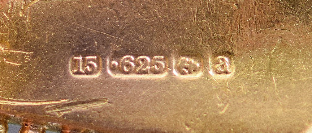 It displays a set of hallmarks, including the mark for 15k gold, the anchor mark for Birmingham, and the "a" date letter corresponding to the year 1875.