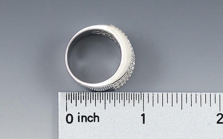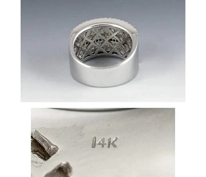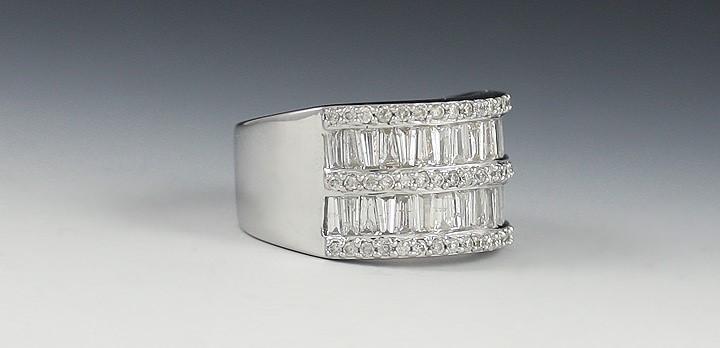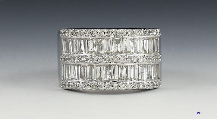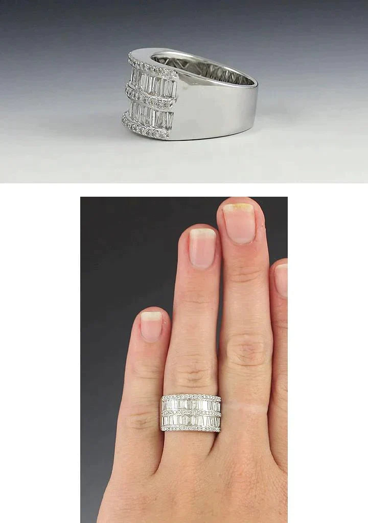 Presented is a beautiful 14k white gold ring set with rows of sparkling