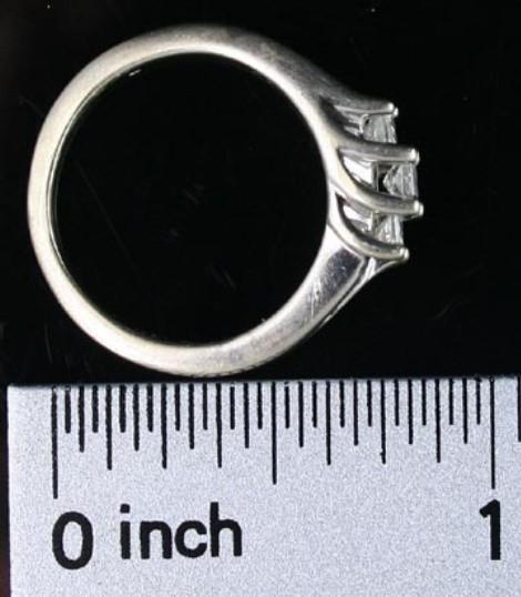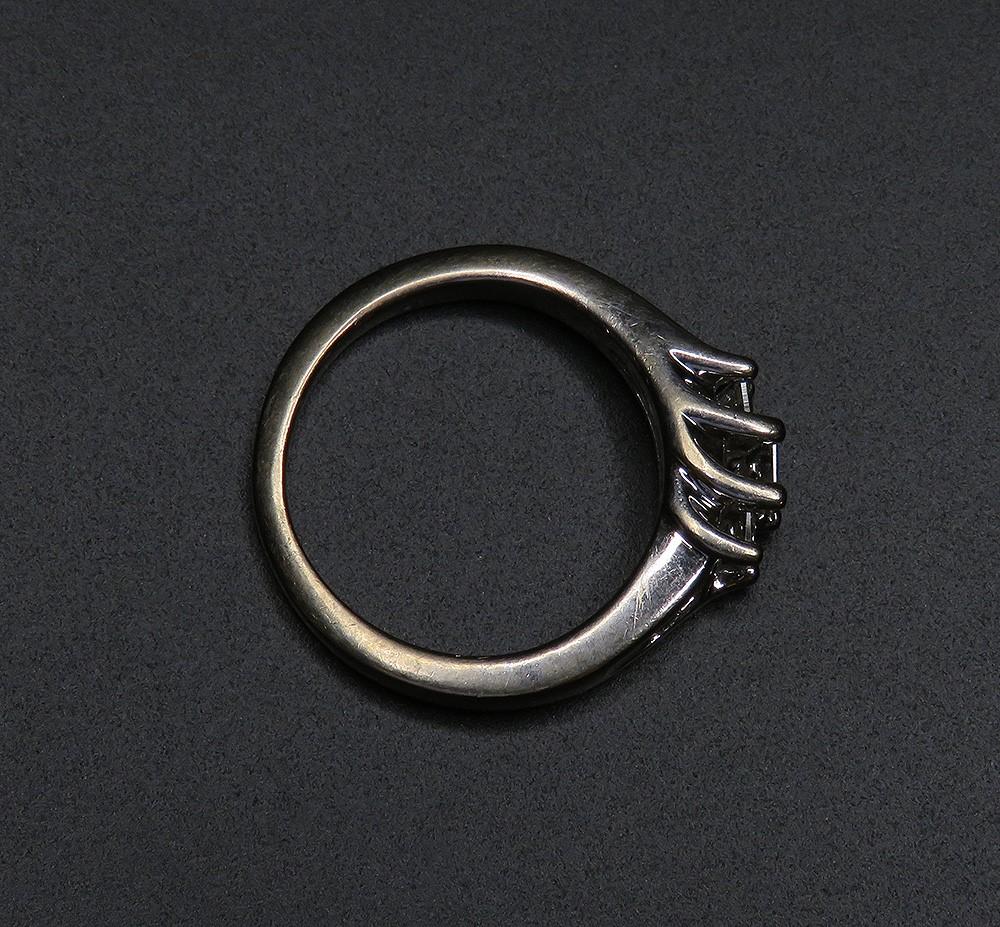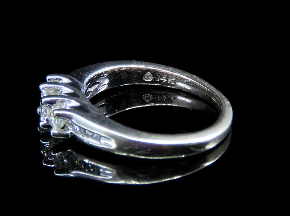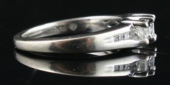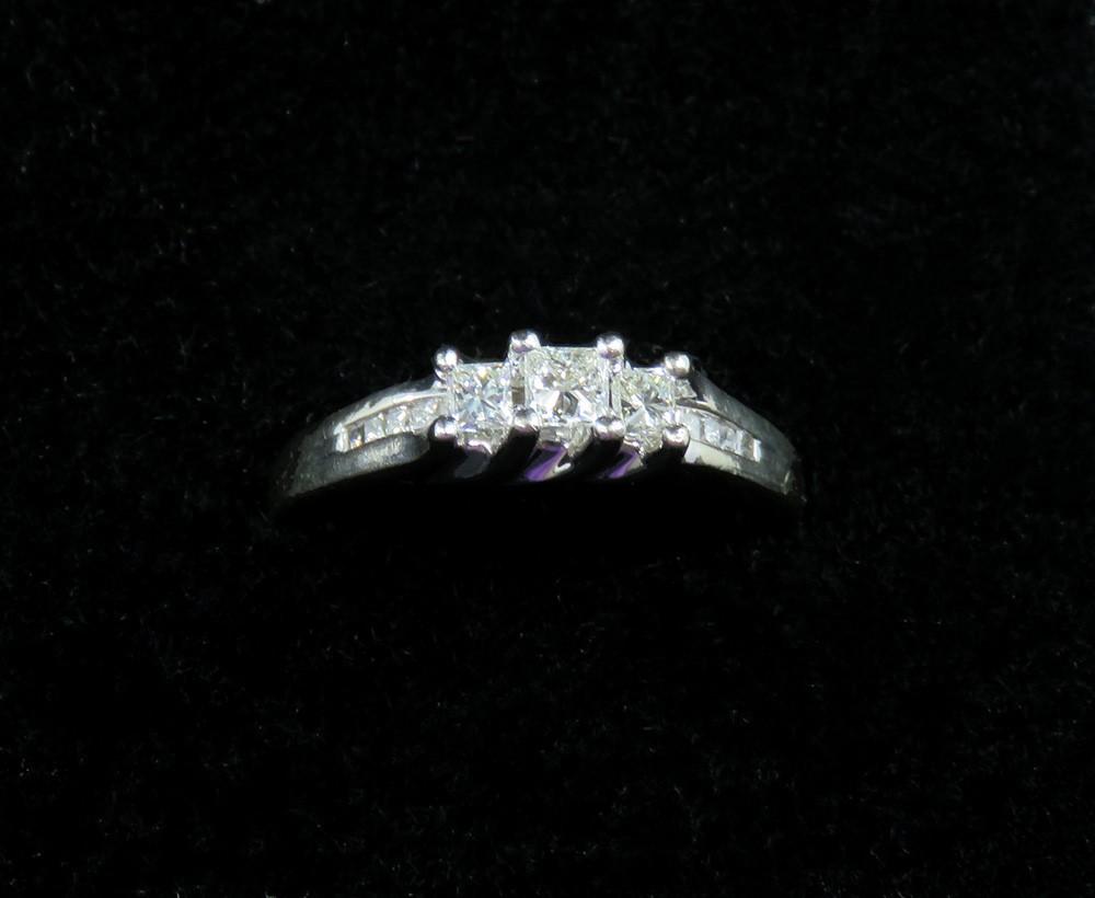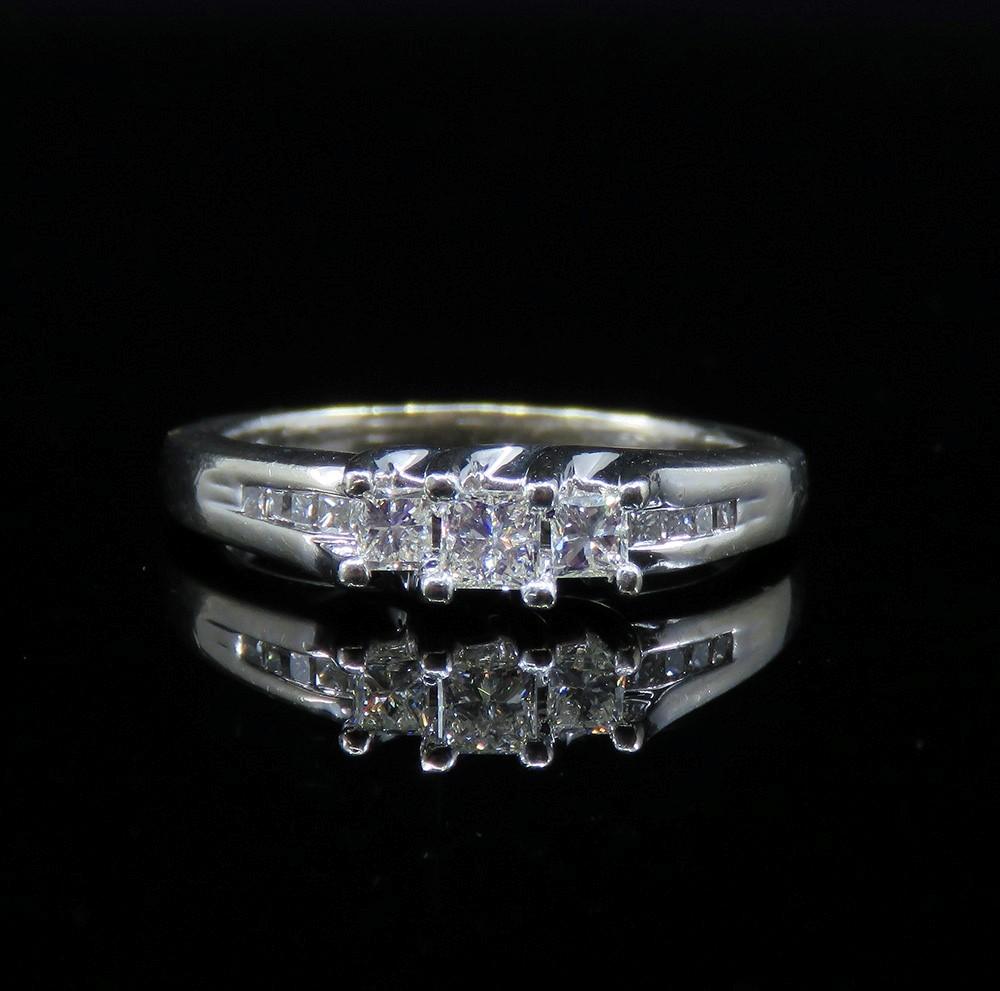 Presented is a wonderful, 14 karat white gold and diamond ring in a size 5 3/4. This modern, American ring is prong set with three square or princess cut diamonds at the top and there are five smaller diamonds graduating in size on either side. The largest diamond in the center is approximately 18 points in size, measuring about 3 millimeters square. The diamonds on either side are approximately 10 points each, measuring about 2.5 millimeters square. The smaller diamonds total about 8 points in weight. The total diamond weight is about 46 points, maybe as much as half a carat. The diamonds are very nice quality stones of VS-1 clarity and H/I color for the center stone, G for the rest.
