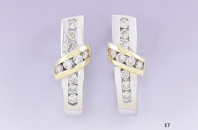 Presented is a gorgeous pair of 14 karat gold and diamond earrings. These are modern earrings, likely of American make. Each earring is done as a vertical white gold channel set with 6 diamonds, crossed on the diagonal with a yellow gold channel set with 4 diamonds. The diamonds are about 5 points each in size, for a total diamond weight of about 1 carat for the pair of earrings. The diamonds are vibrant, dazzling stones of SI to I-1 clarity and I/J color. The earrings have omega style backs with posts, for pierced ears.