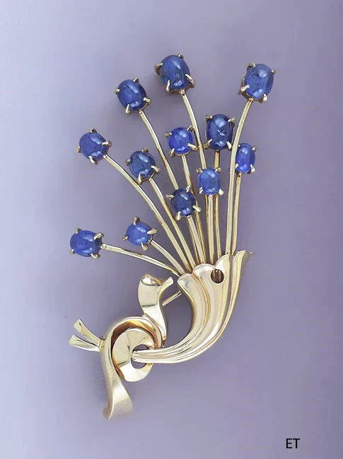 Gorgeous Retro 14k Gold Sapphire Floral Spray Pin / Brooch