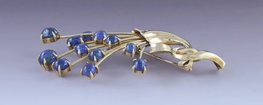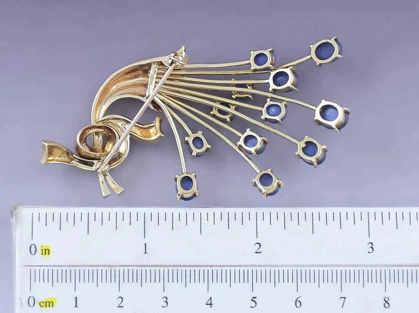 This piece is in great condition. The clasp functions well and closes securely. The sapphires are all securely set, with no chips. There are no breaks and no repairs. This piece is not stamped or hallmarked, but we have tested it with nitric acid and guarantee it to be 14 karat gold. The pin is about 2 3/4 inches long.This piece weighs 18.4 grams.