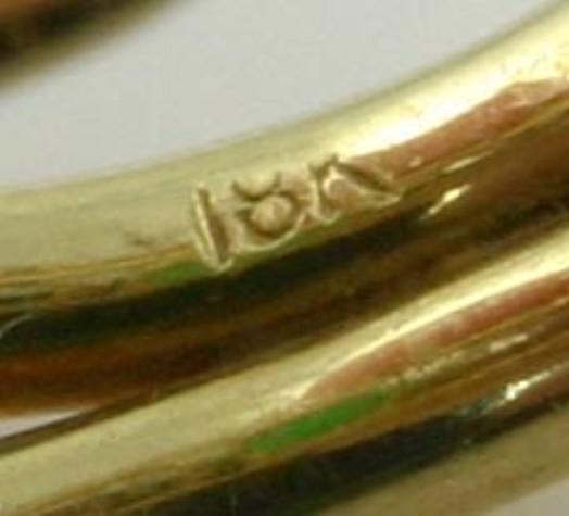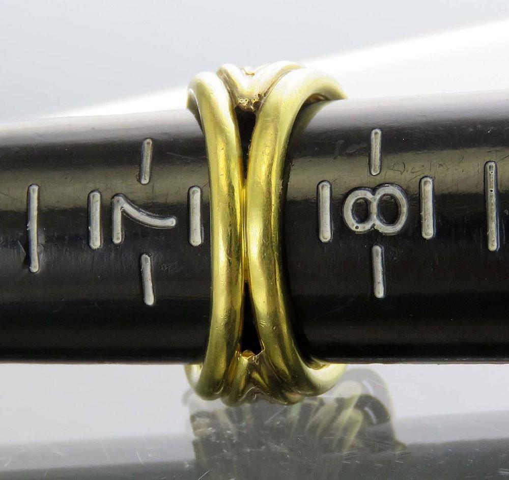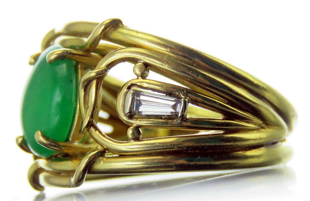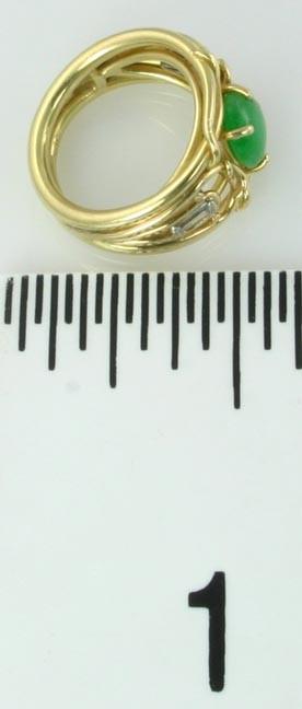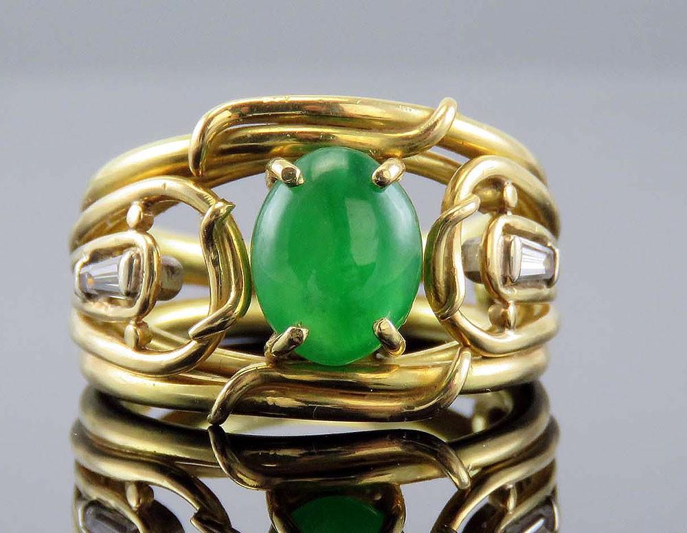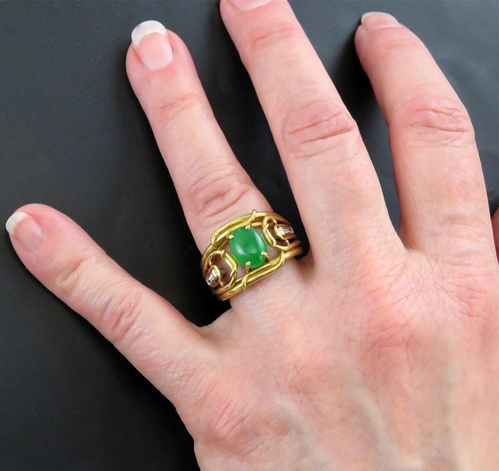 Presented is a lovely 18K gold ring. The ring has an interesting design with different yellow gold bands intertwining to support an oval jadeite cabochon at the center and diamonds on either side. This piece was almost certainly custom-made. The jadeite is very fine quality, much much better than our photos show. The ring is modern, probably made in the past 50 years. The two diamonds
