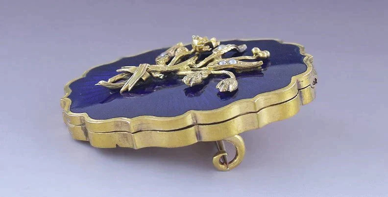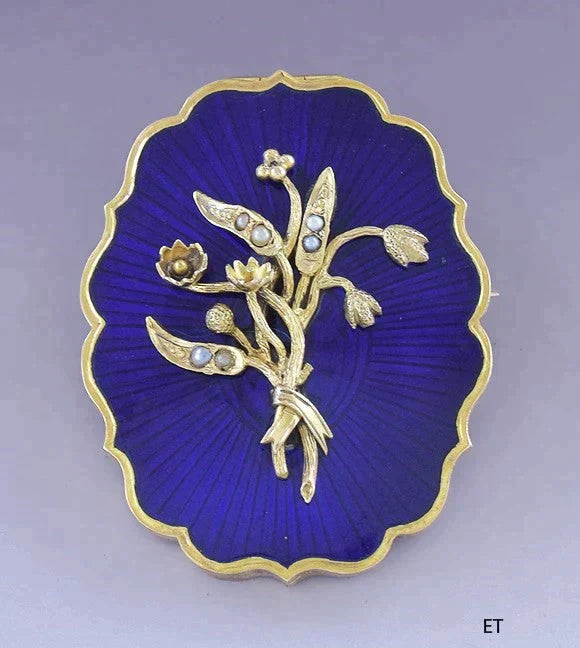 Gorgeous Victorian 14k Gold Cobalt Guilloche Enamel Pearl Locket Pin / Brooch
