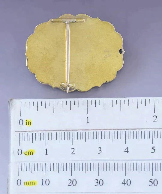 This piece is not stamped or hallmarked, but we have tested it with nitric acid and guarantee it to be at least 14 karat gold. The pin measures about 1 1/2 by 1 1/8 inches.