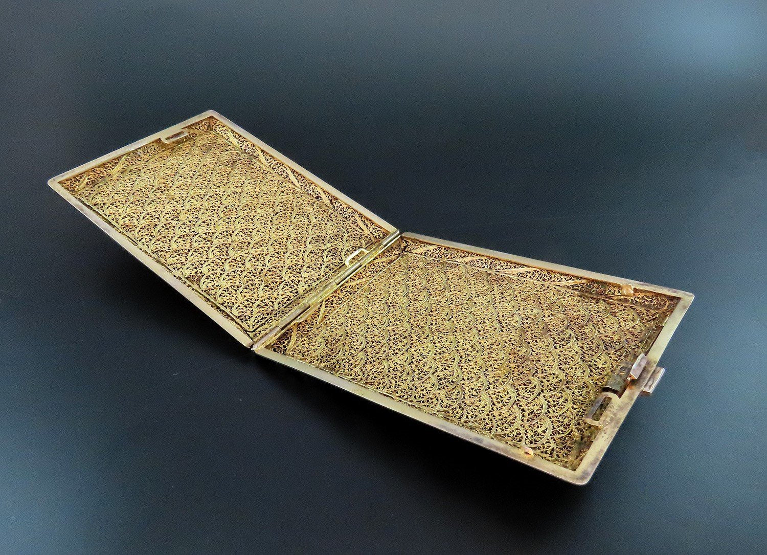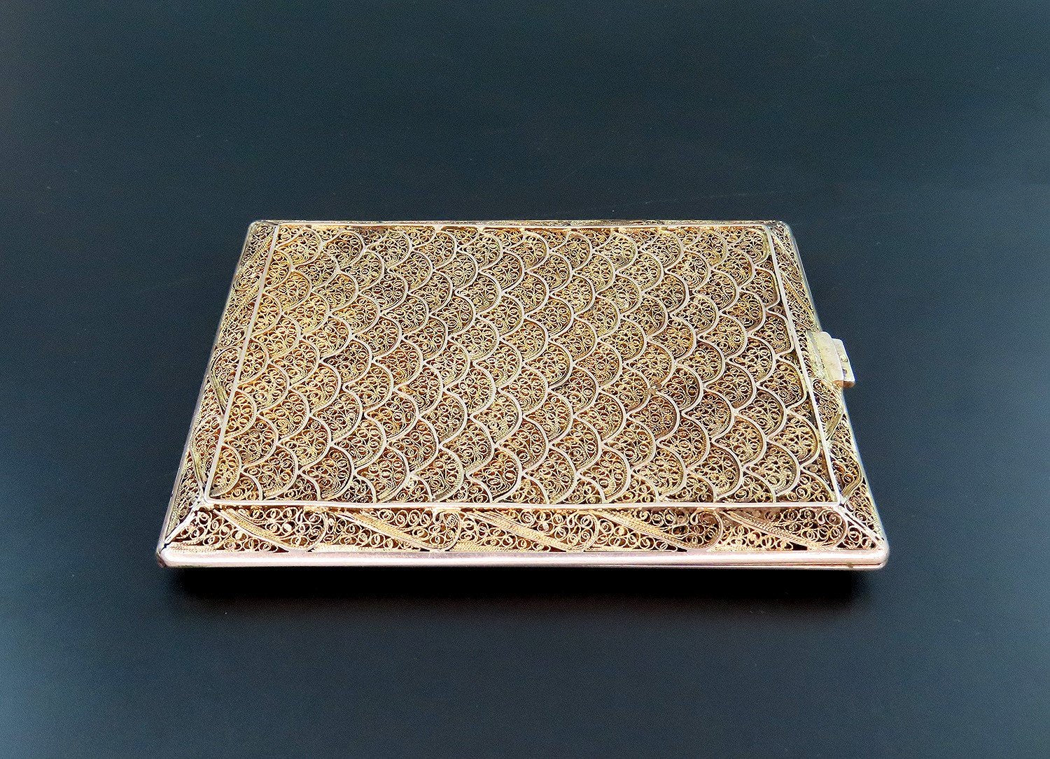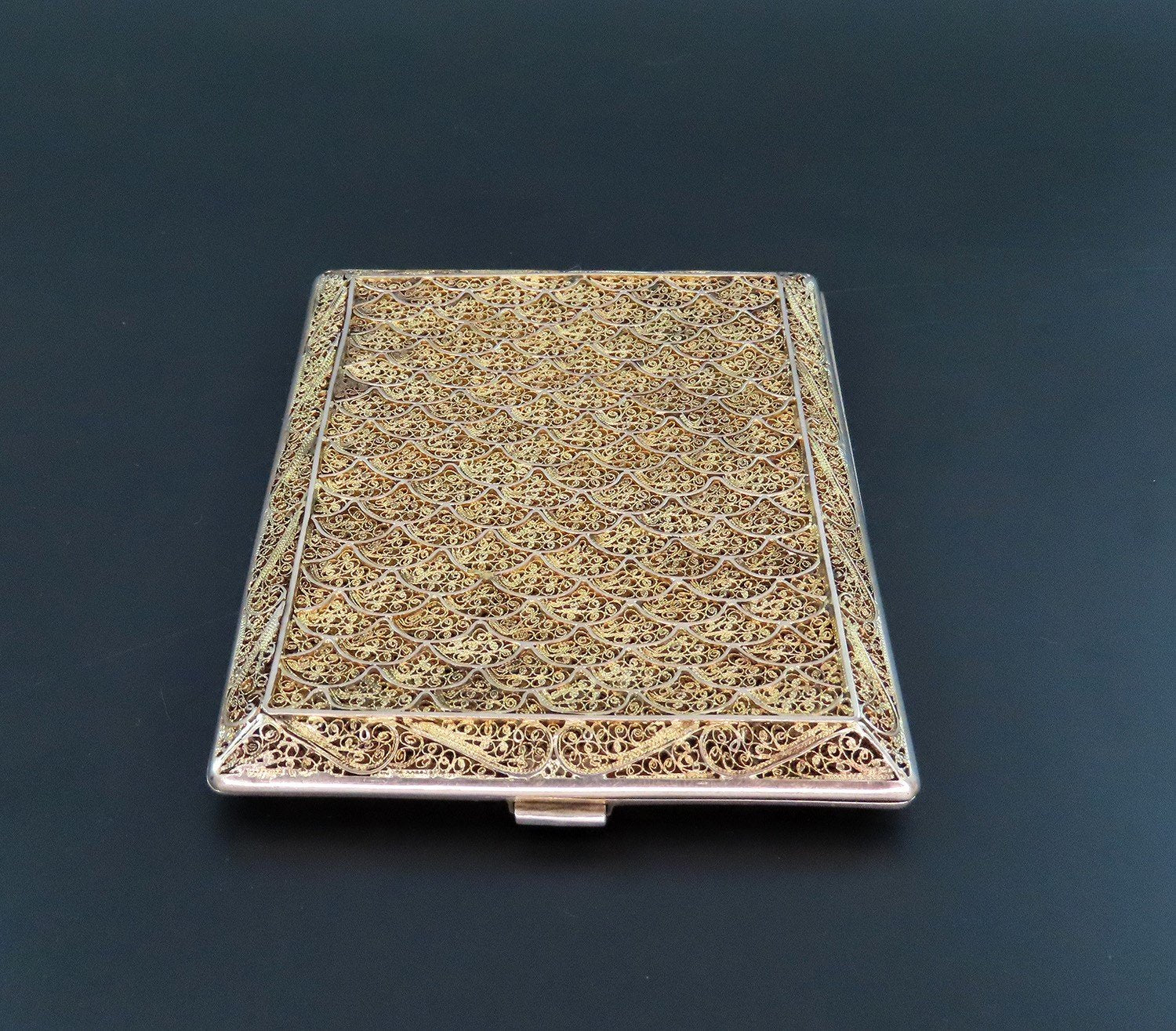 Presented is a gorgeous Portuguese silver cigarette case. This piece has a fabulous gold wash and displays intricate wire decorations in between the fan and scroll patterns. The clasp works well and closes with a satisfying click.