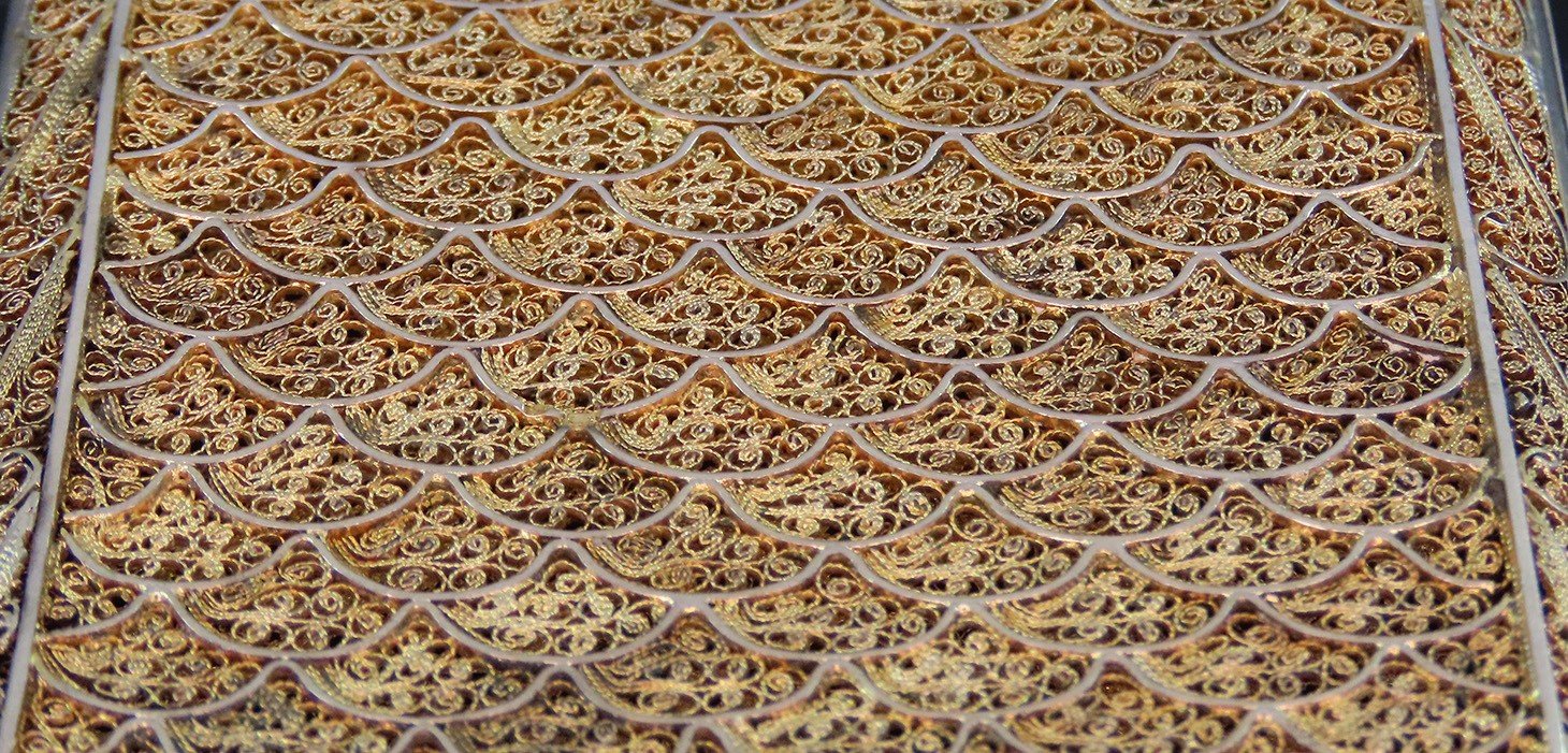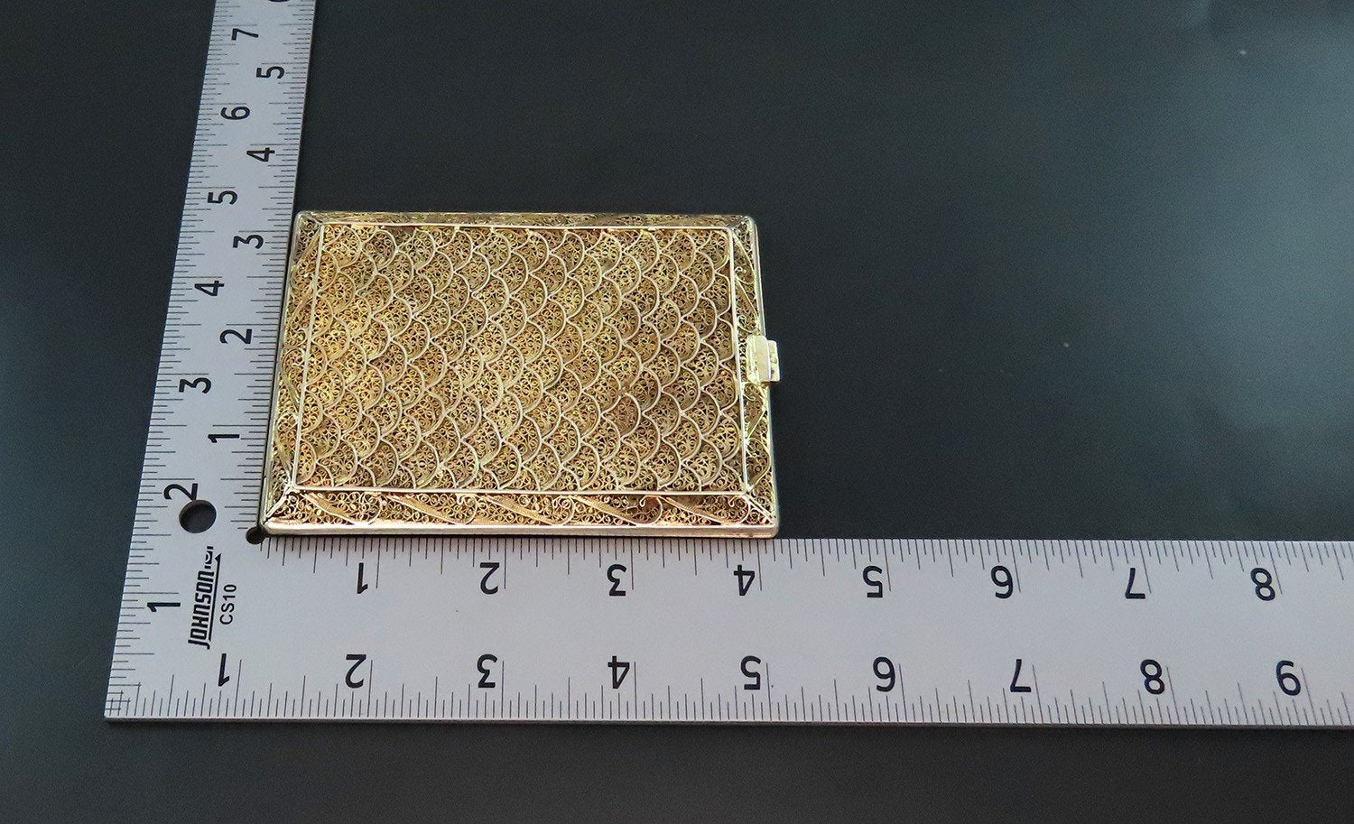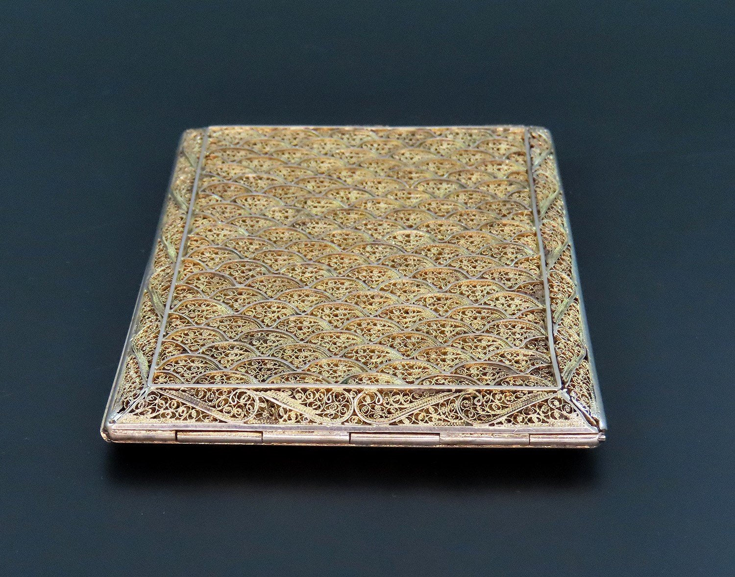 Presented is a gorgeous Portuguese silver cigarette case. This piece has a fabulous gold wash and displays intricate wire decorations in between the fan and scroll patterns. The clasp works well and closes with a satisfying click.