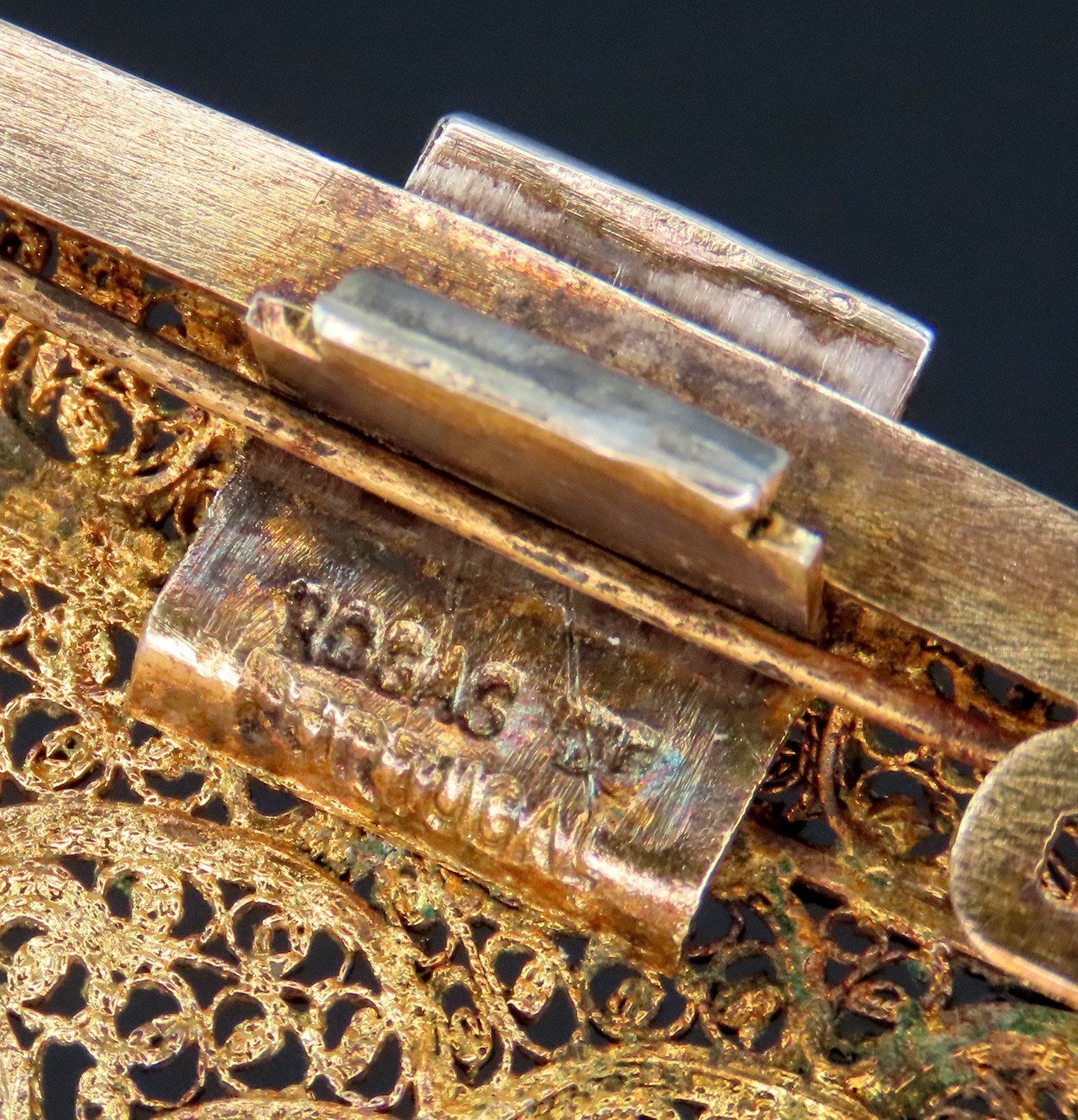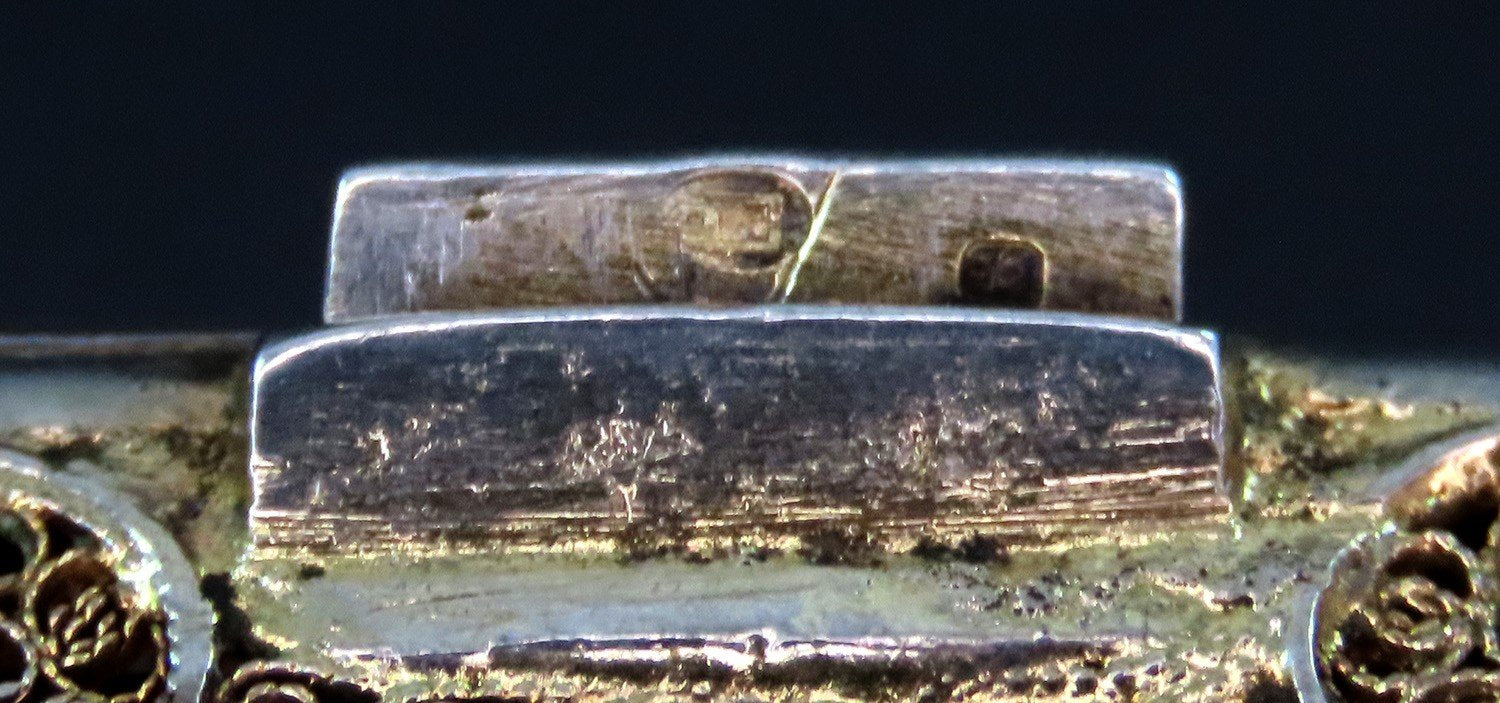 The piece is marked on the clasp mechanism with Rosas de Portugal and the city hallmark for Oporto. It appears that there is also a maker's mark but we were unable to identity the mark. The case is .833 purity silver.
