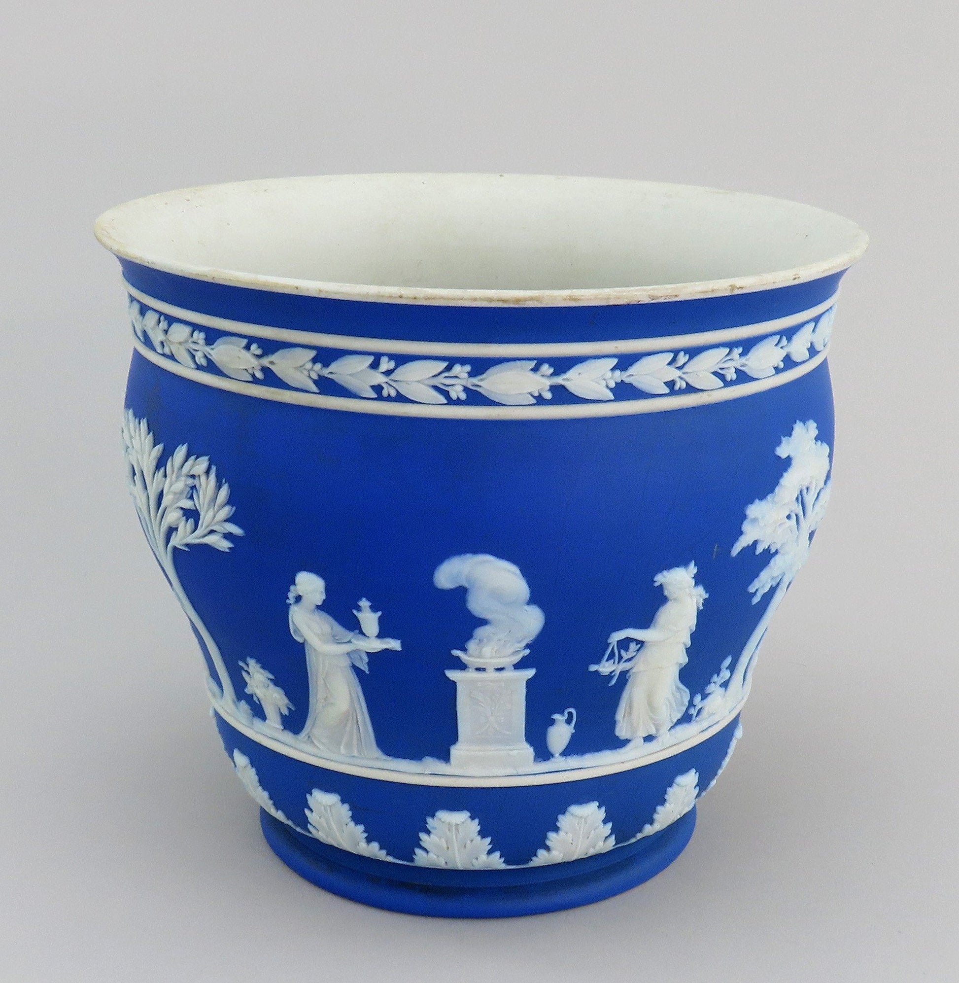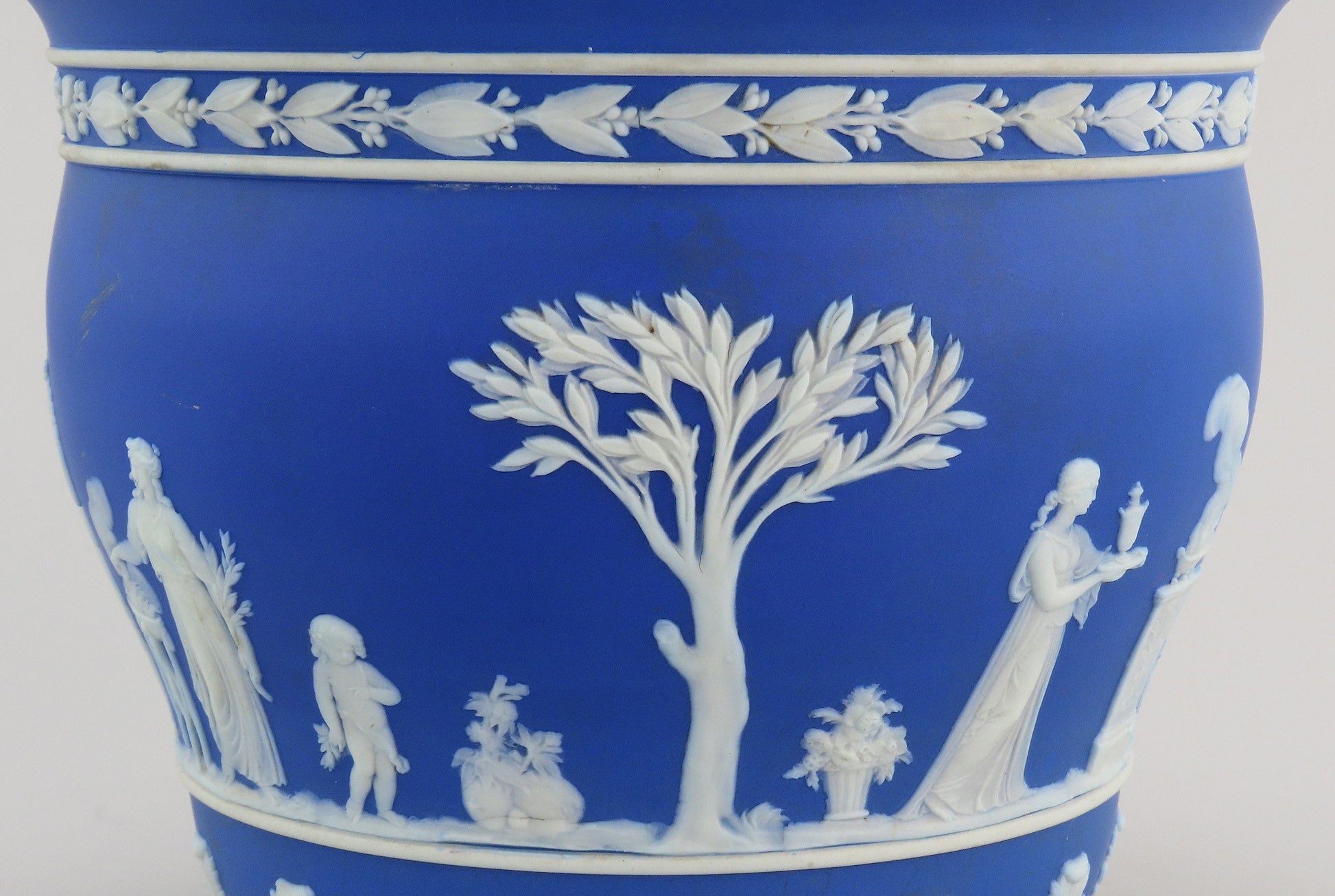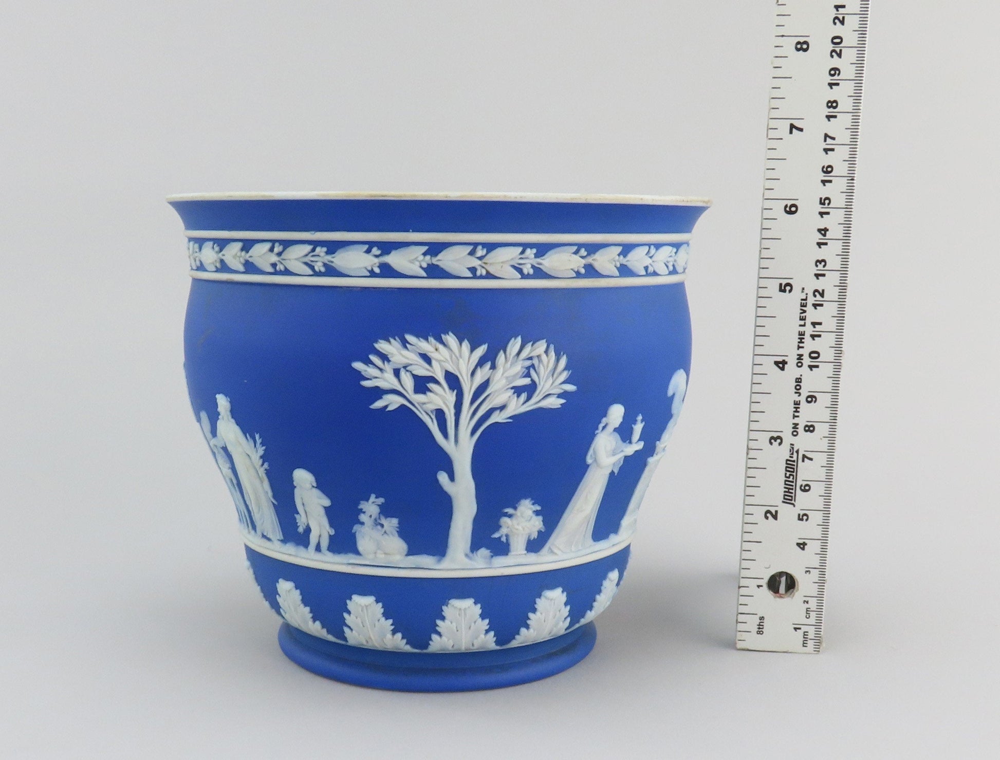 Presented is a beautiful Wedgwood blue jasperware round planter from 1897. This piece displays classical Greek scenes with a floral border above and below, all in raised relief. The planter has a rich blue color with white/cream decorations.