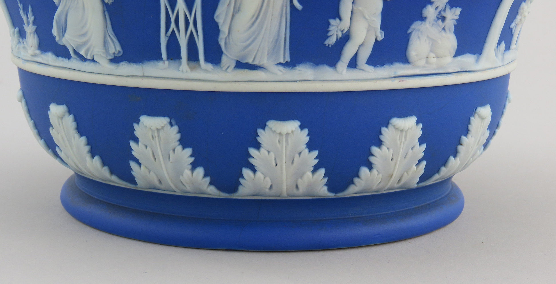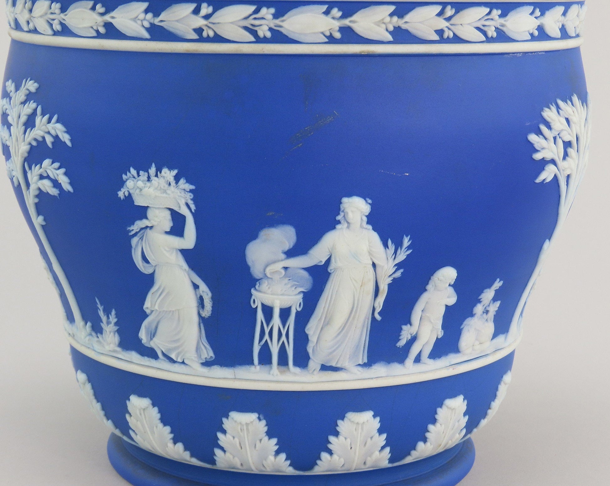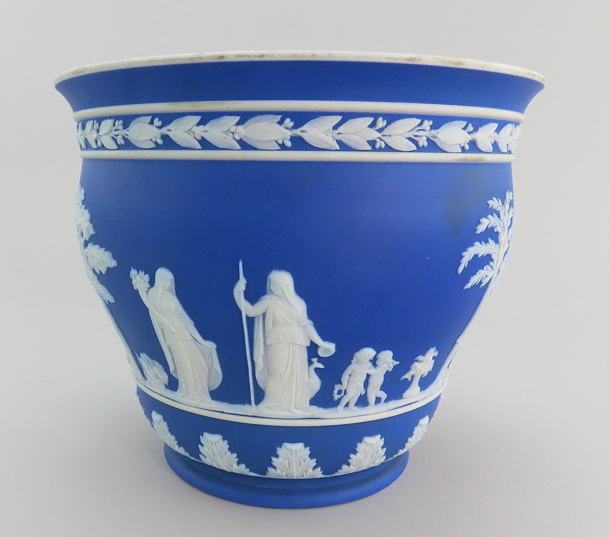 Presented is a beautiful Wedgwood blue jasperware round planter from 1897. This piece displays classical Greek scenes with a floral border above and below, all in raised relief. The planter has a rich blue color with white/cream decorations.