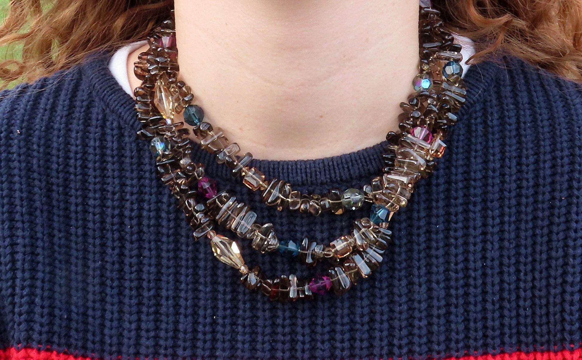 This necklace is in great condition. The three strands can be worn twisted or straight. There are no breaks and no repairs.