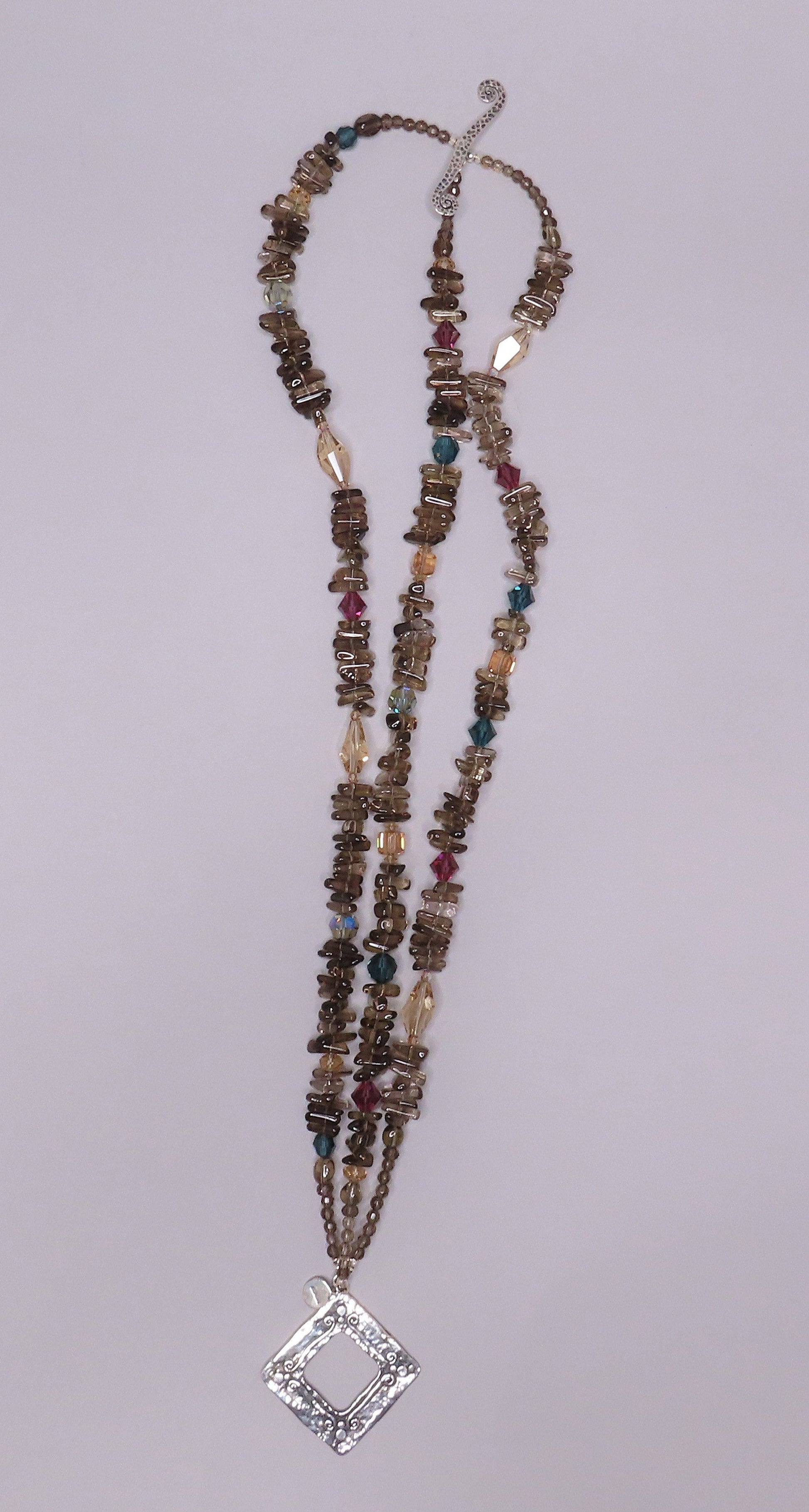 Presented is a great three stand beaded necklace with a sterling silver toggle. This piece display a collection of brown, orange, blue, and purple beads across all three strands. The toggle is of significant size with artisan decorations.
