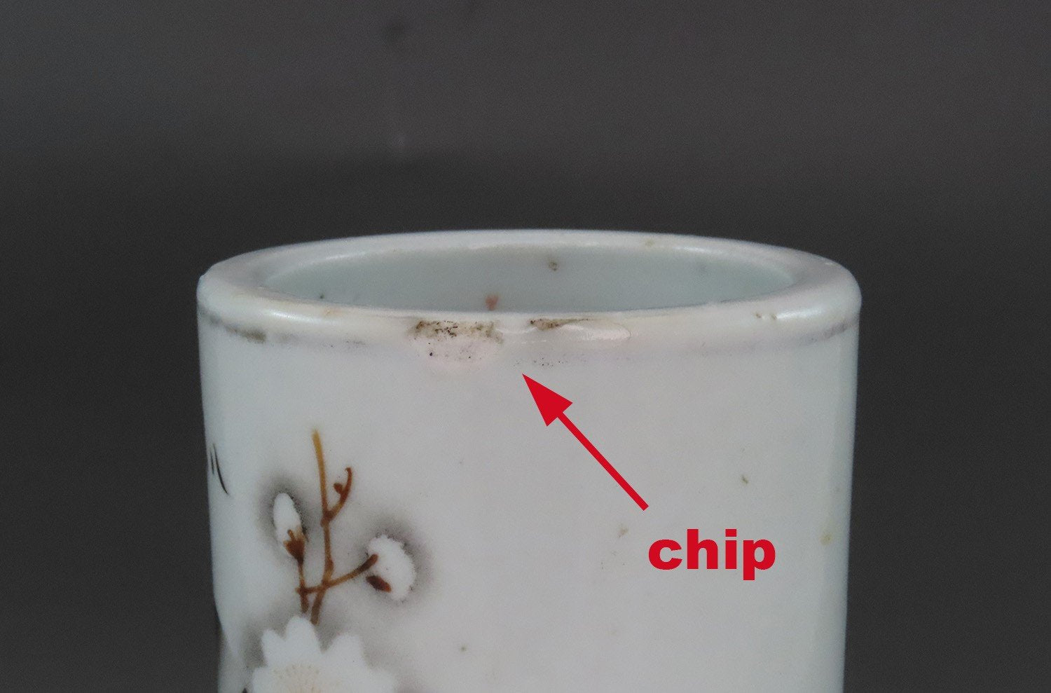 Great Antique Asian Porcelain Brush Pot Hand Painted Bird and Flowers