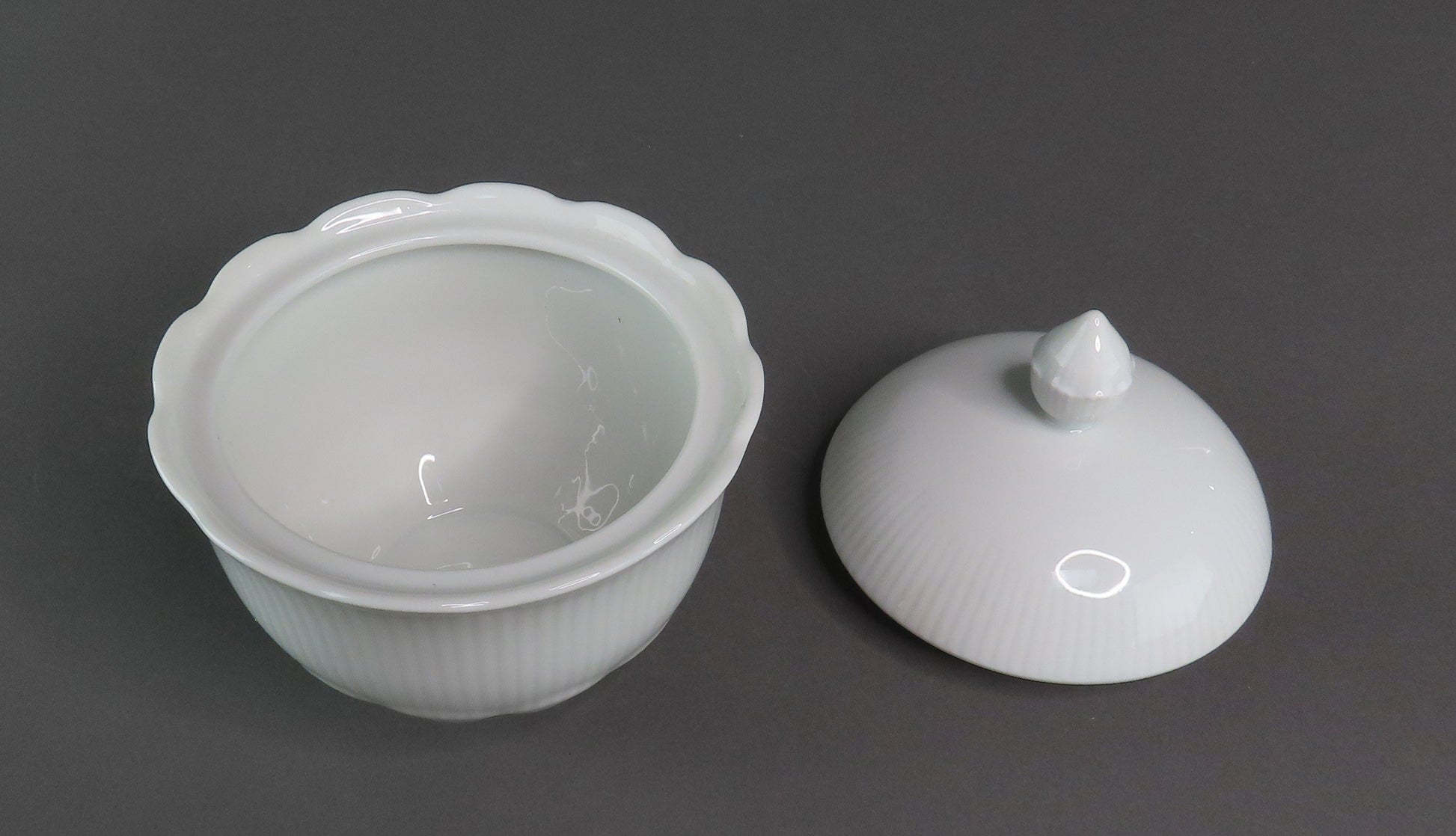 Presented is a porcelain sugar bowl and creamer pair from Kaiser. This pair is in the Romantica pattern, which was produced between 1988-2004. This pattern displays a scalloped edge with subtle vertical ribbing decoration around the piece and the border of the lid.