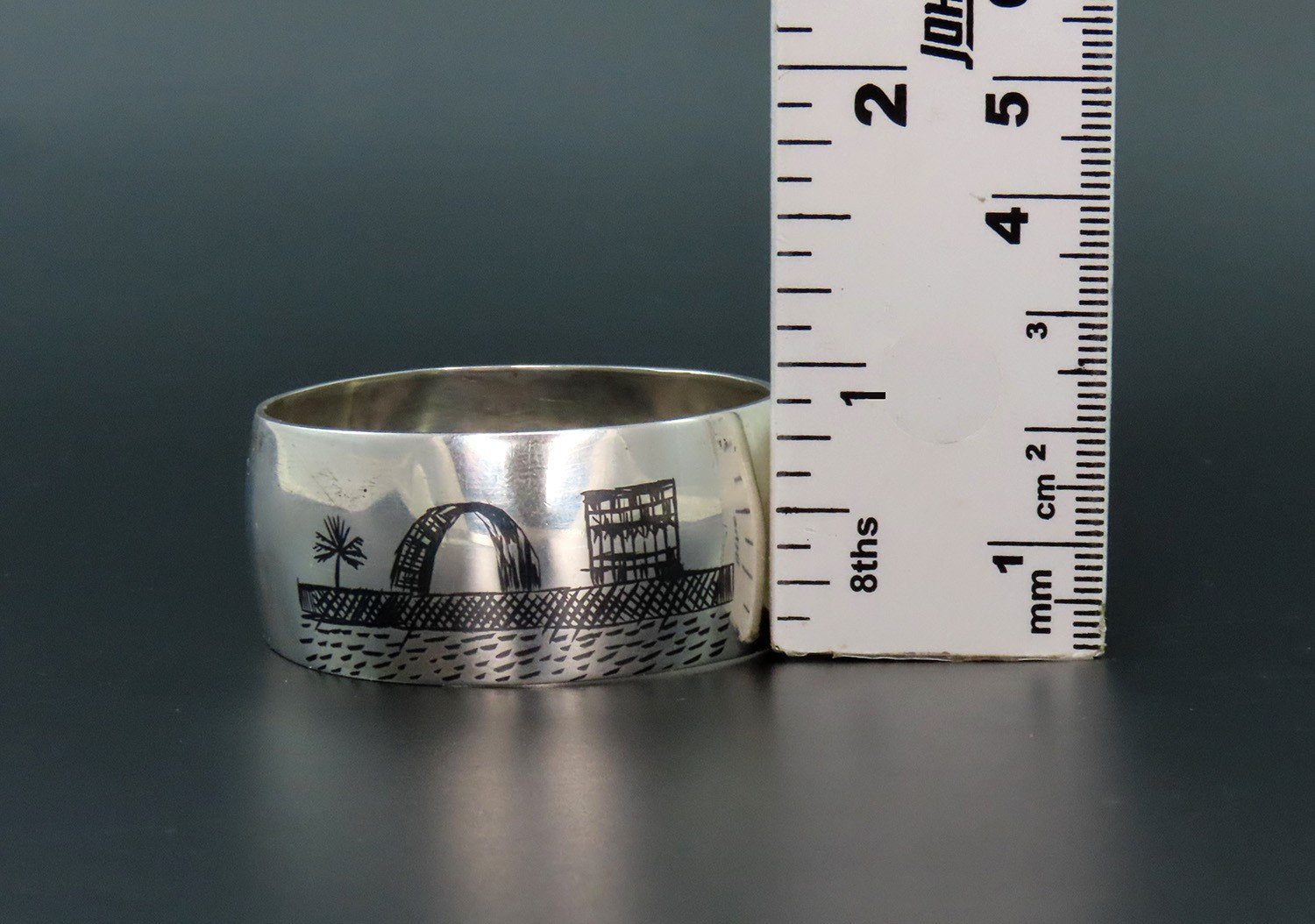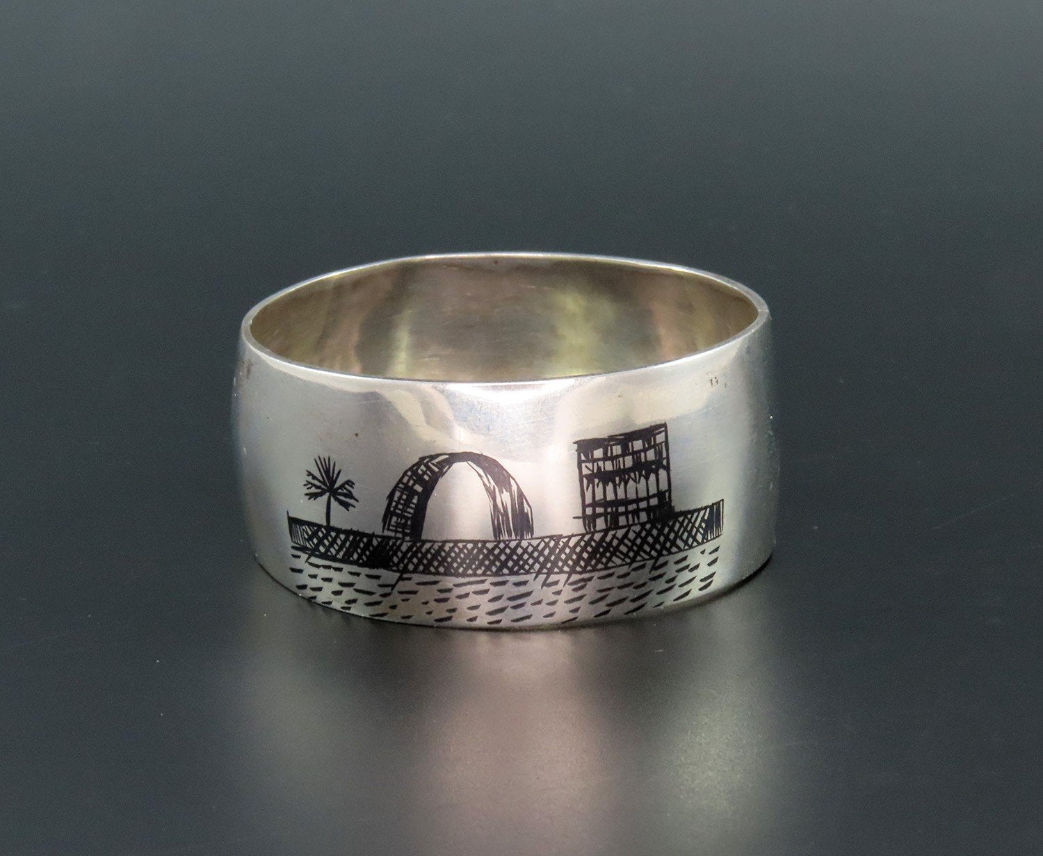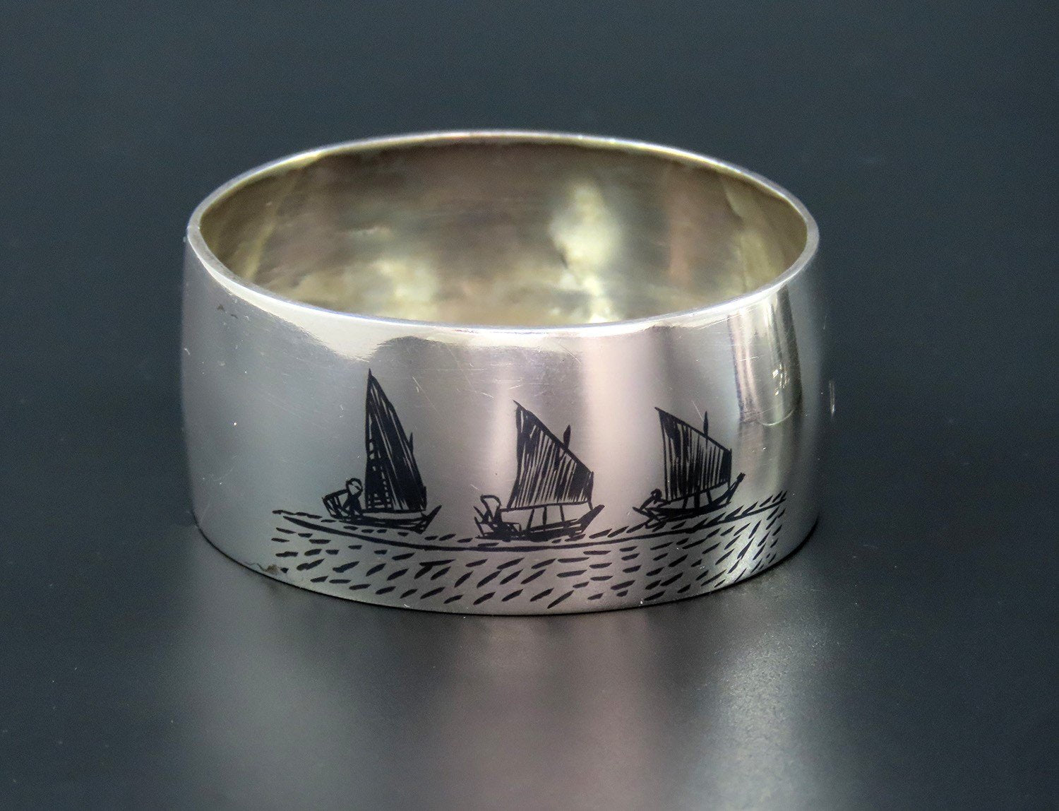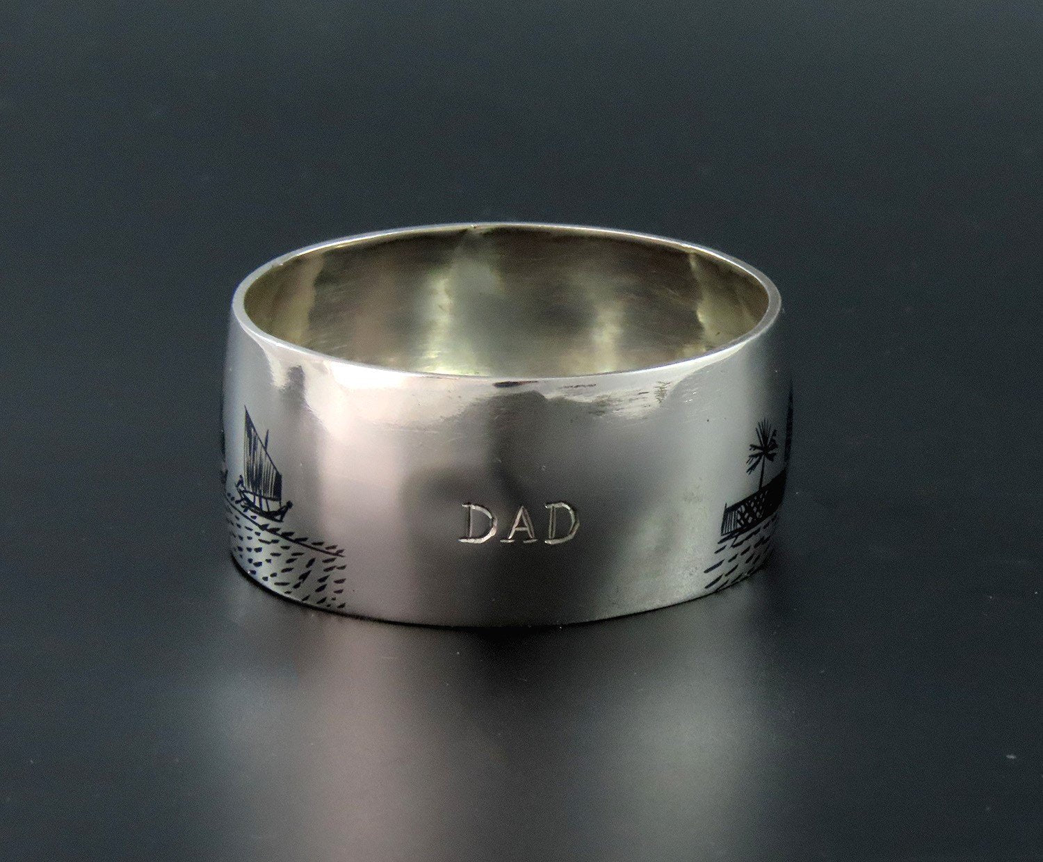 Presented is a great Middle Eastern engraved silver napkin ring. This piece displays two decorative enamel scenes; one with three boats and the other with buildings. Between the scenes, the ring is engraved “Dad”.