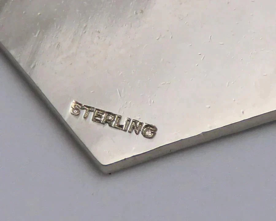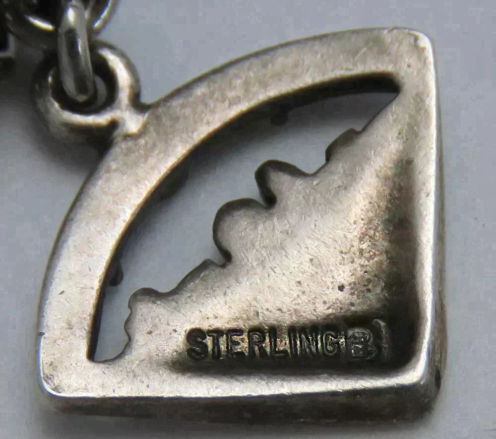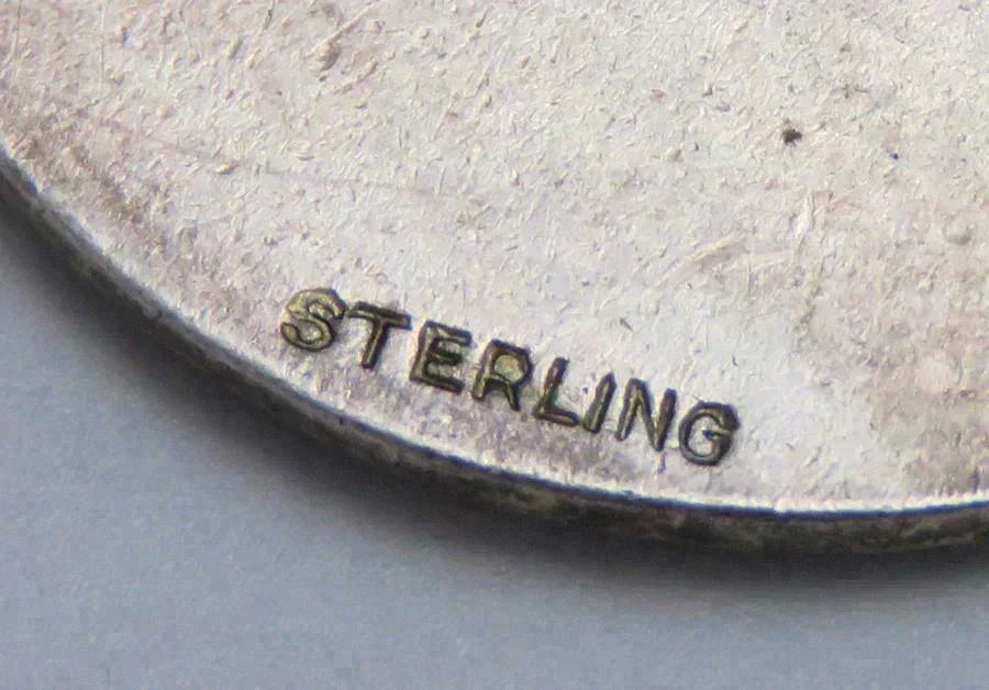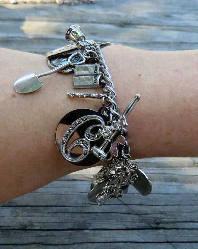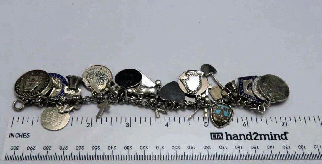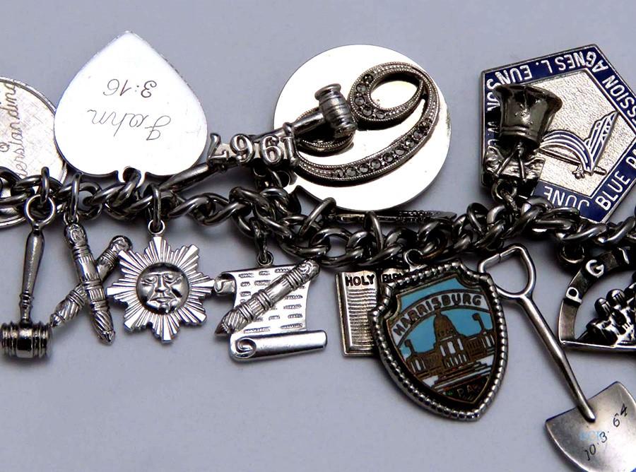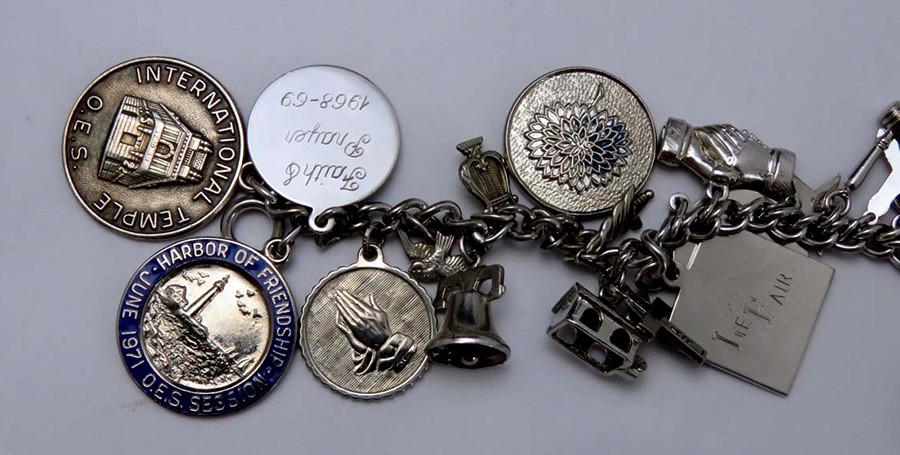 All of the charms are sterling silver, except the Fidelity Session medallion with the floral design on the reverse. On the wedding bell charm, the applied bell design and the applied C monogram are both sterling silver, but the disk they are mounted to is not. Many of the charms are stamped sterling on either the charm itself or the loop connecting it to the bracelet. All have been tested with nitric acid and are guaranteed sterling silver unless otherwise noted above. The bracelet itself is stamped sterling on the clasp.