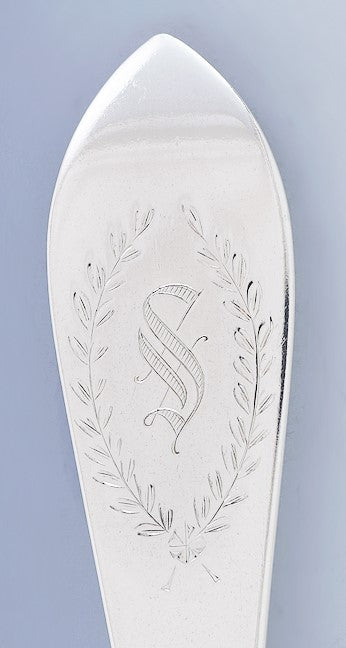 Presented is a wonderful set of 10 Dominick & Haff sterling silver fish forks. These forks are made in the elegant Pointed Antique (#3 Engraved) pattern, which began production in 1895. This is a variant on the stylish Pointed Antique pattern which features an engraved wreath design on the handles. Inside the wreath cartouche is a monogram of S in Gothic script. The forks have three tines, with a notch on the outward edge of both exterior tines, suitable for fish, salad, meat, or whatever else.