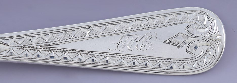 Great set 12 Antique American Sterling Silver Bright Cut Dessert Spoons
