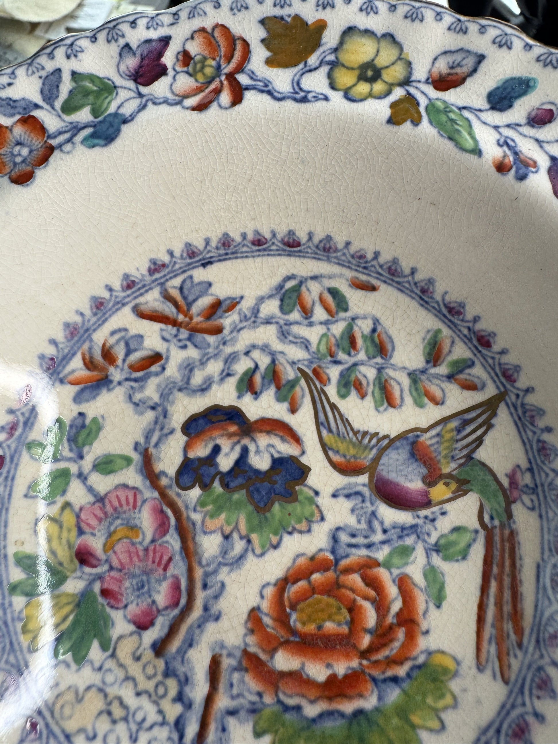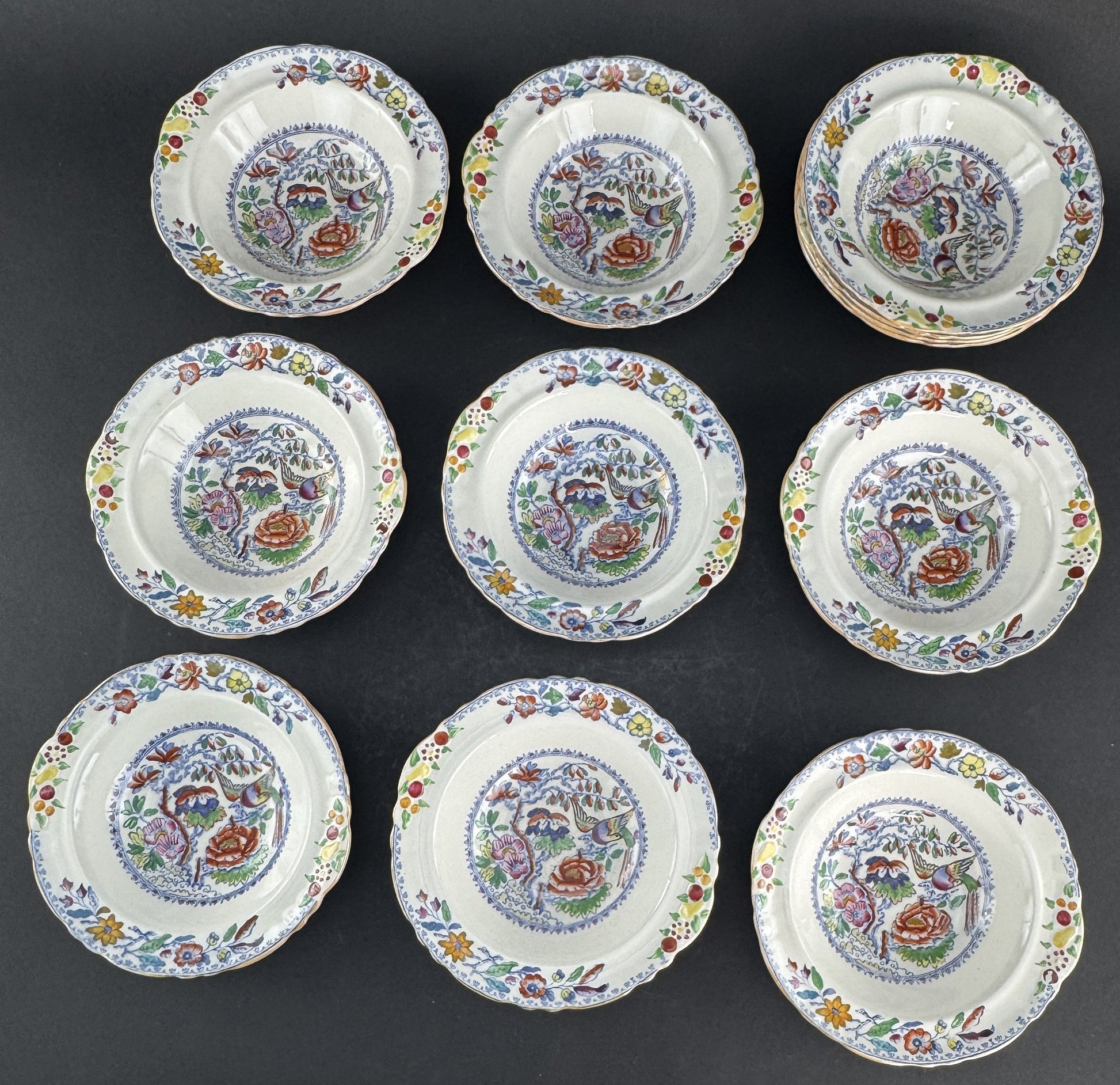This set is in great overall condition. All of the bowls have some cracklature to the glaze, as we've already seen in many other Mason's Flying Bird lots/pieces from this time, but none are discolored. There are no chips, cracks, breaks, or repairs.