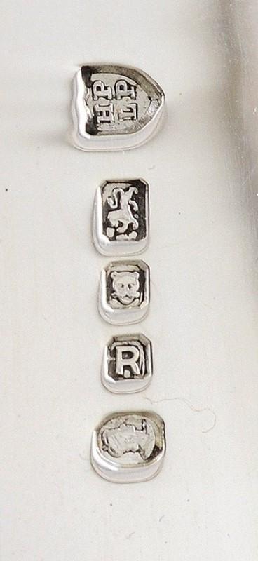Each knife is hallmarked on the blade with the lion passant for sterling silver, the leopard's head for the city of London, the date letter R for 1952, the commemorative coronation stamp of Queen Elizabeth's profile, and the maker's mark HP LP for Herbert & Laurie Parsons, trading as Tessiers Ltd.