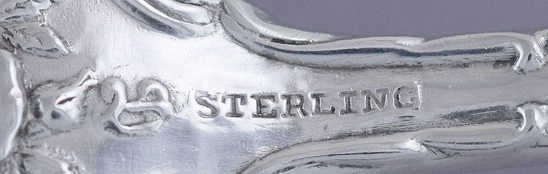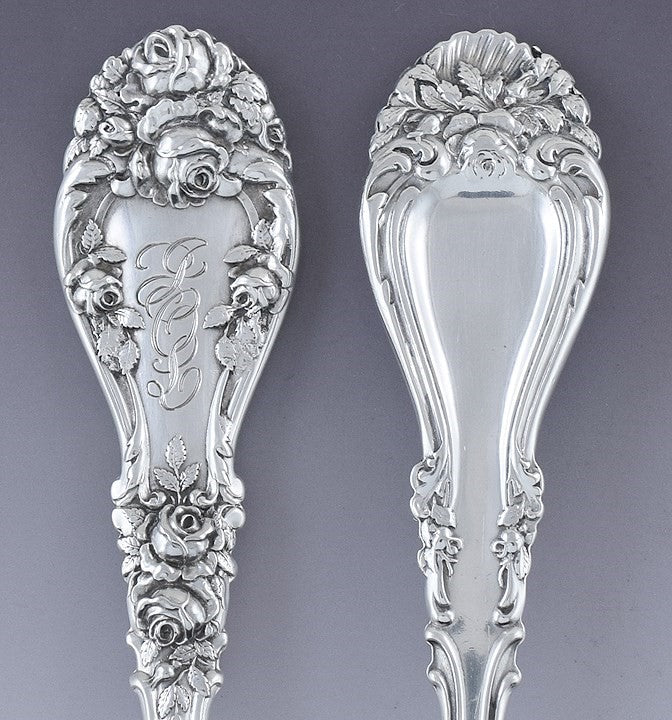 This set is in great overall condition. The details of the design are nice and crisp. There are some knife marks to the backs of the tines, as you'd expect. There are no splits, no breaks, no dents, no monogram removals, and no repairs.