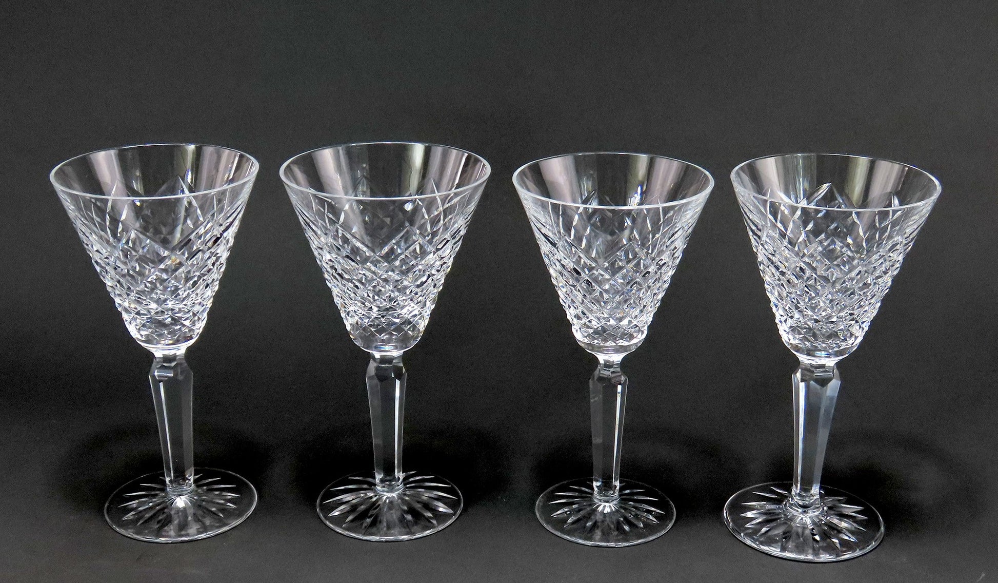 Presented is a set of 4 glass Claret red wine glasses from Waterford. This set is in the Templemore pattern which displays an elegant cross-hatched cut design. This pattern shows many rhombus facets that allow the glass to sparkle and reflect light. The base of the glass is cut on the underside with a star pattern around the center. The stem has a hexagonal faceted shape. We do have more glasses in the pattern, please check other listing on our page for more of this or other sizes.