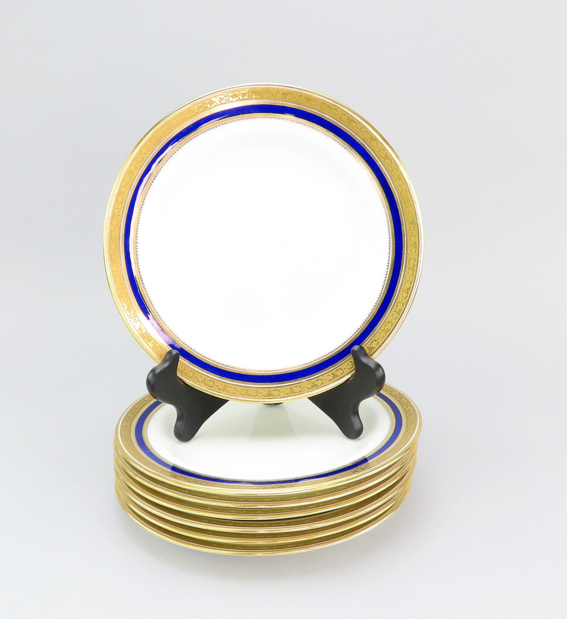 Great Set 7 Cauldon English Porcelain Luncheon Plates L6228 Cobalt/Gold Border