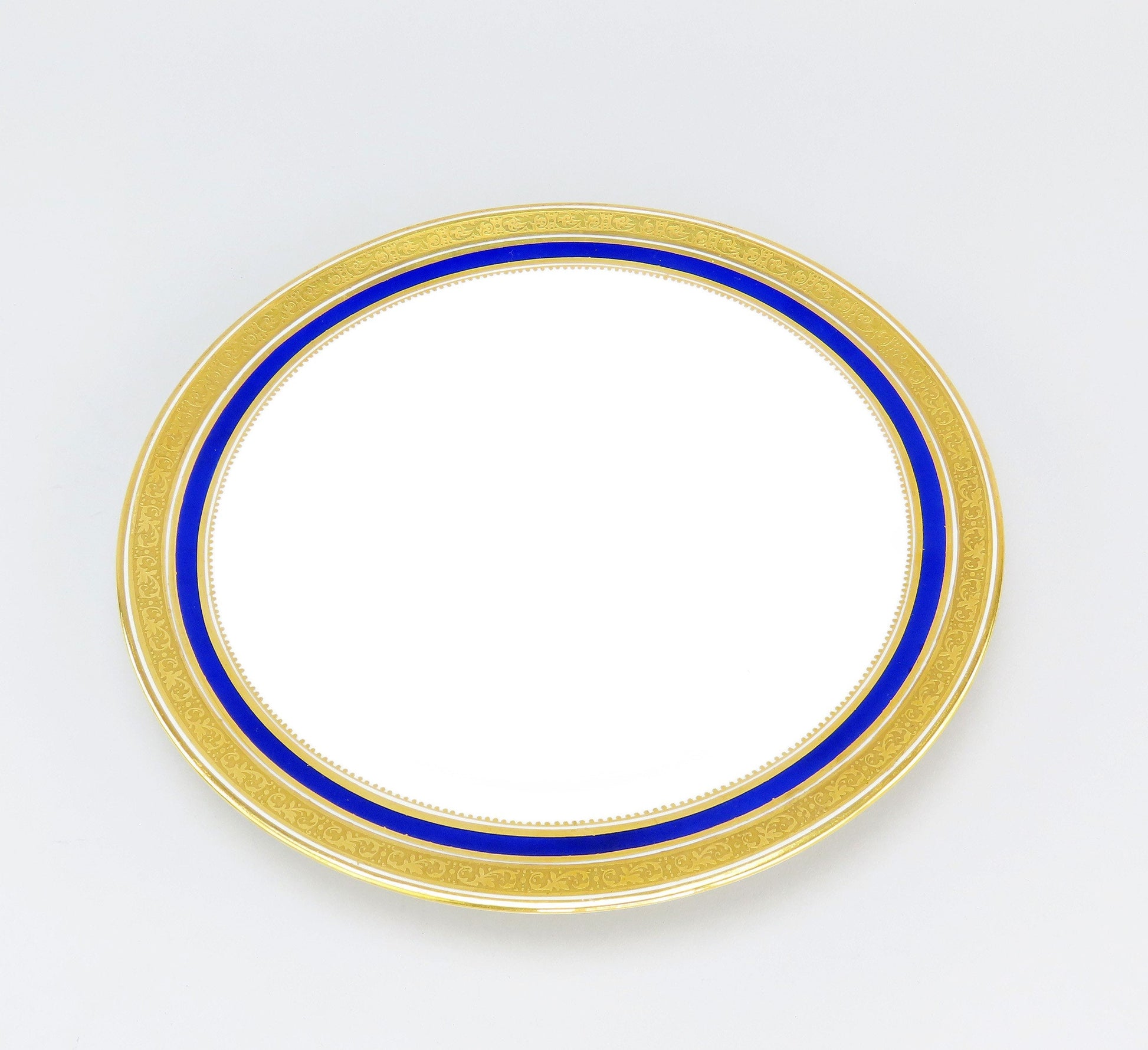 Presented is a great set of 7 porcelain luncheon plates from Cauldon. This set displays a fancy cobalt blue and gold border with a bright white center. The perimeter of each plate has a great gilded edge. These plates were made between 1900 to 1925.