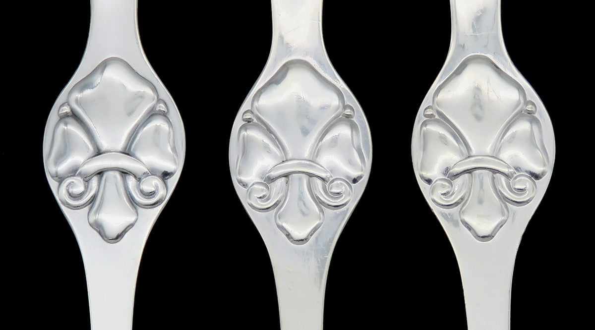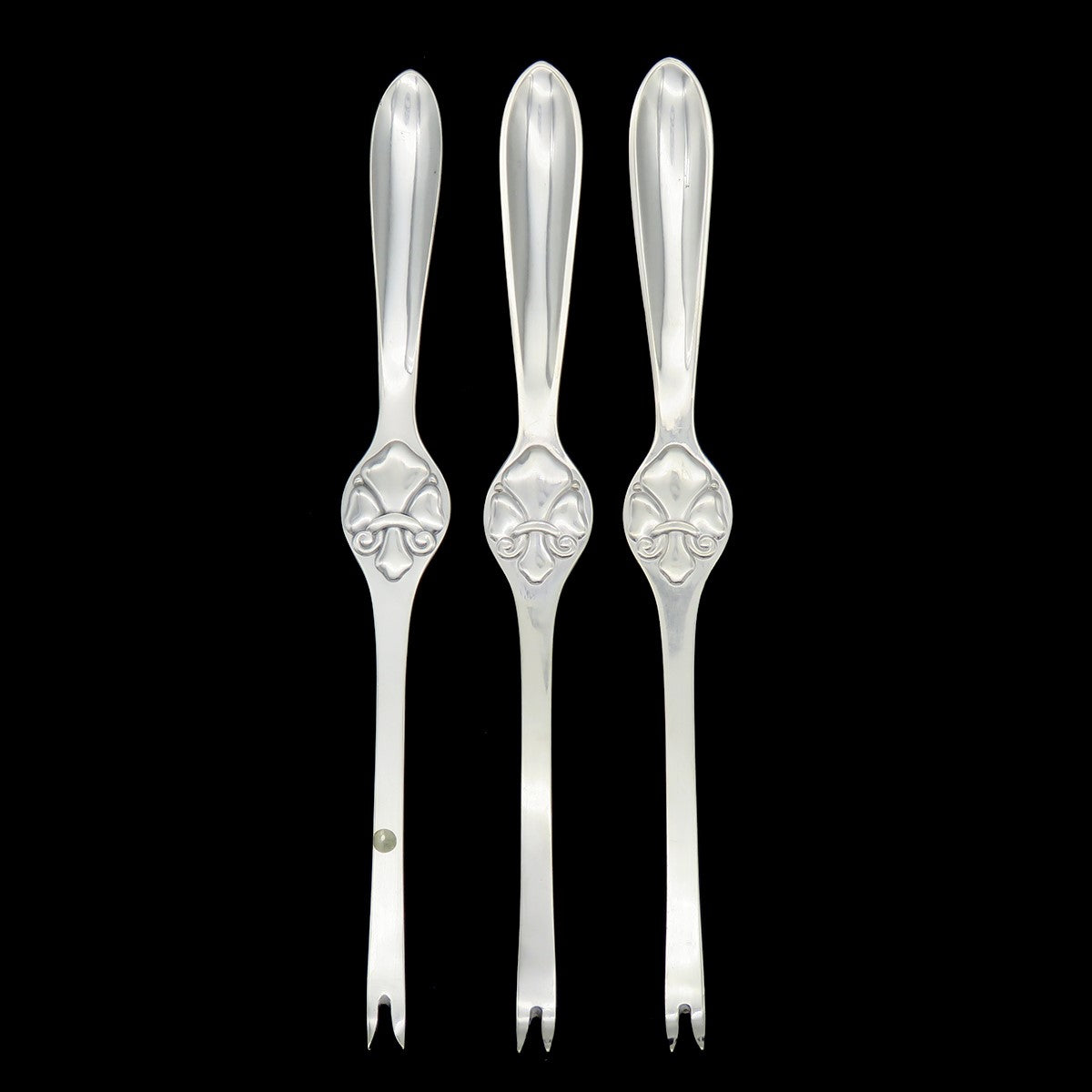 Presented is a set of 3 Danish silver lobster picks. This set has a large fleur-de-lis on the front in a wide middle section. The handle end has an elegant curved shape. The picks have two firm tines.