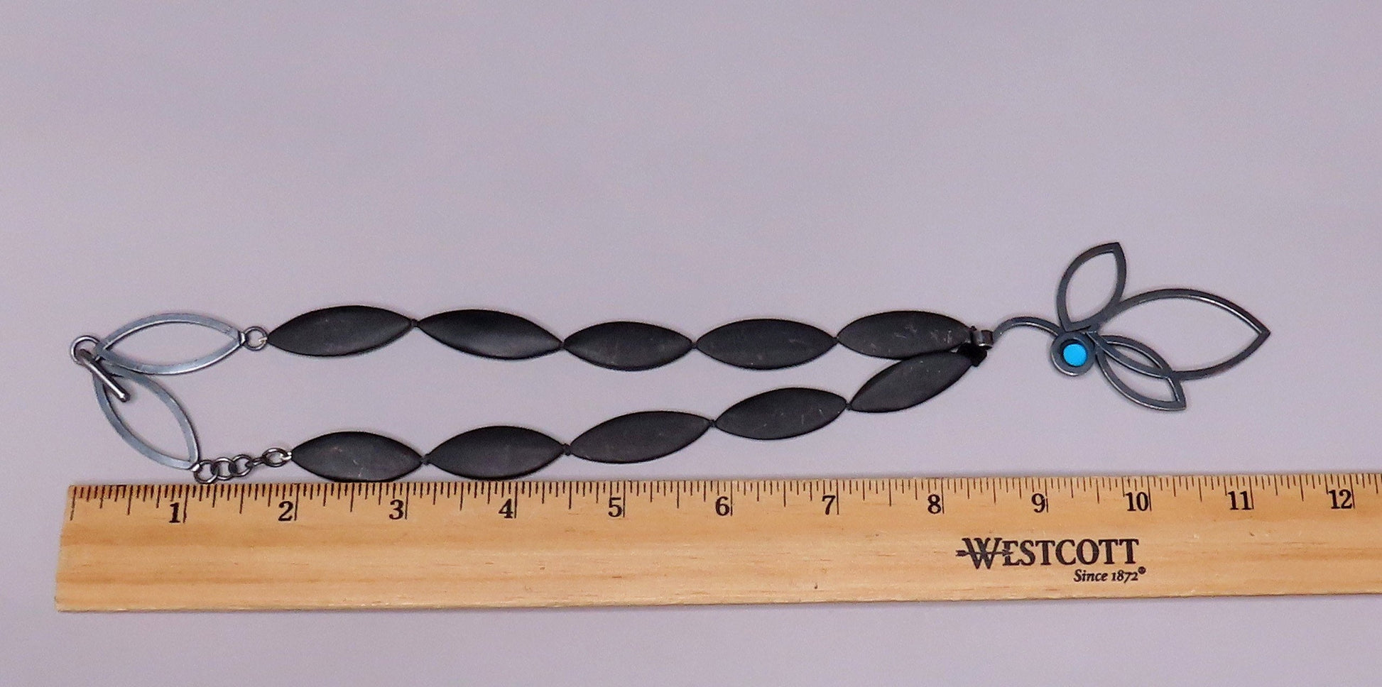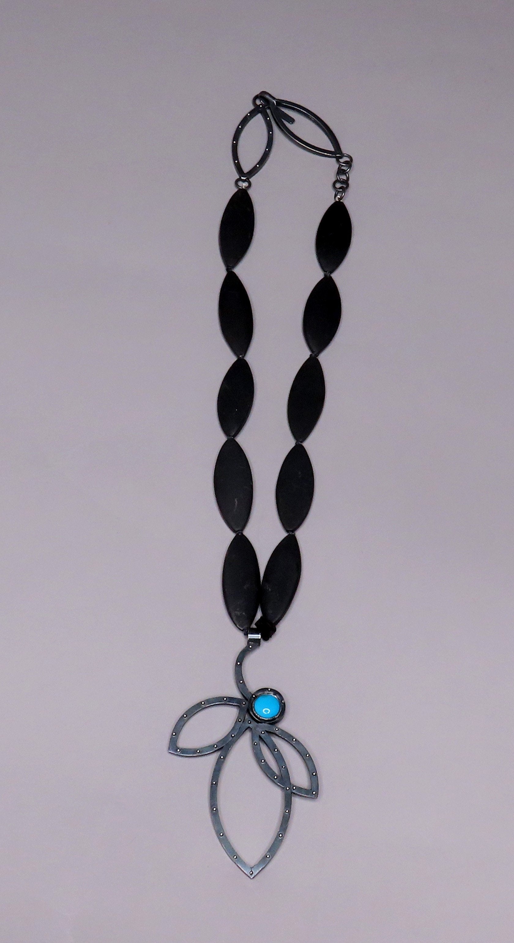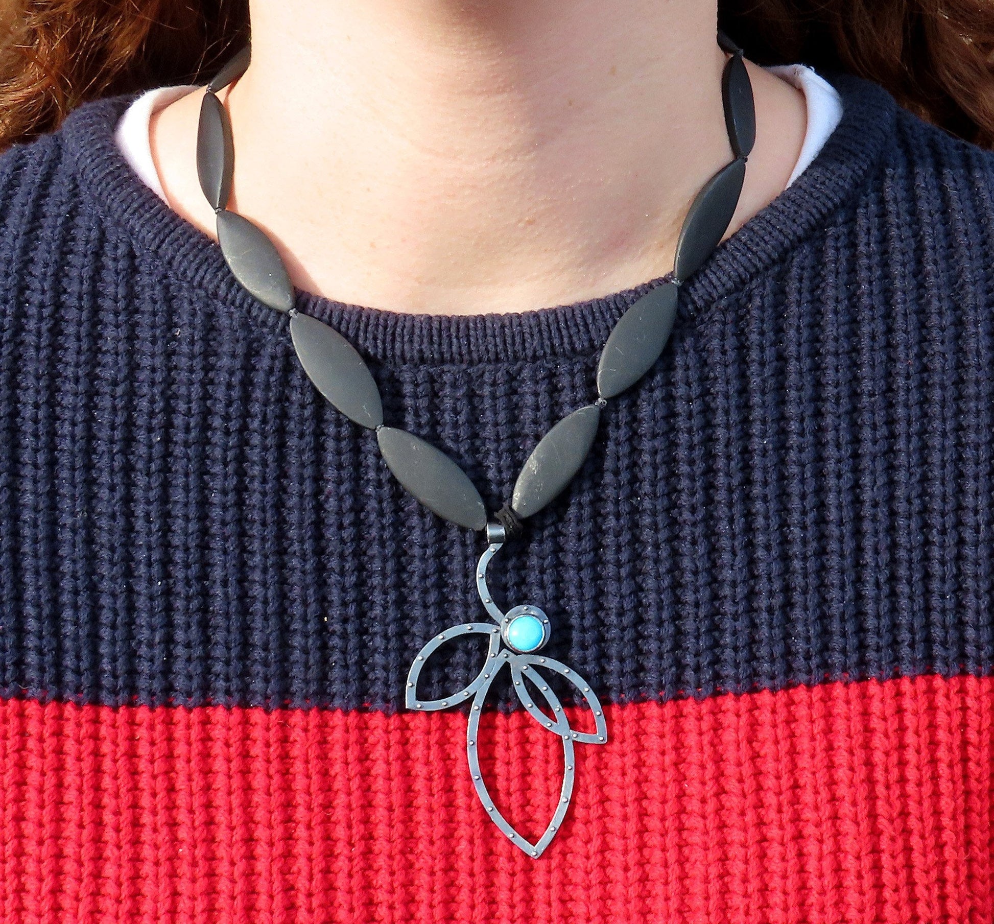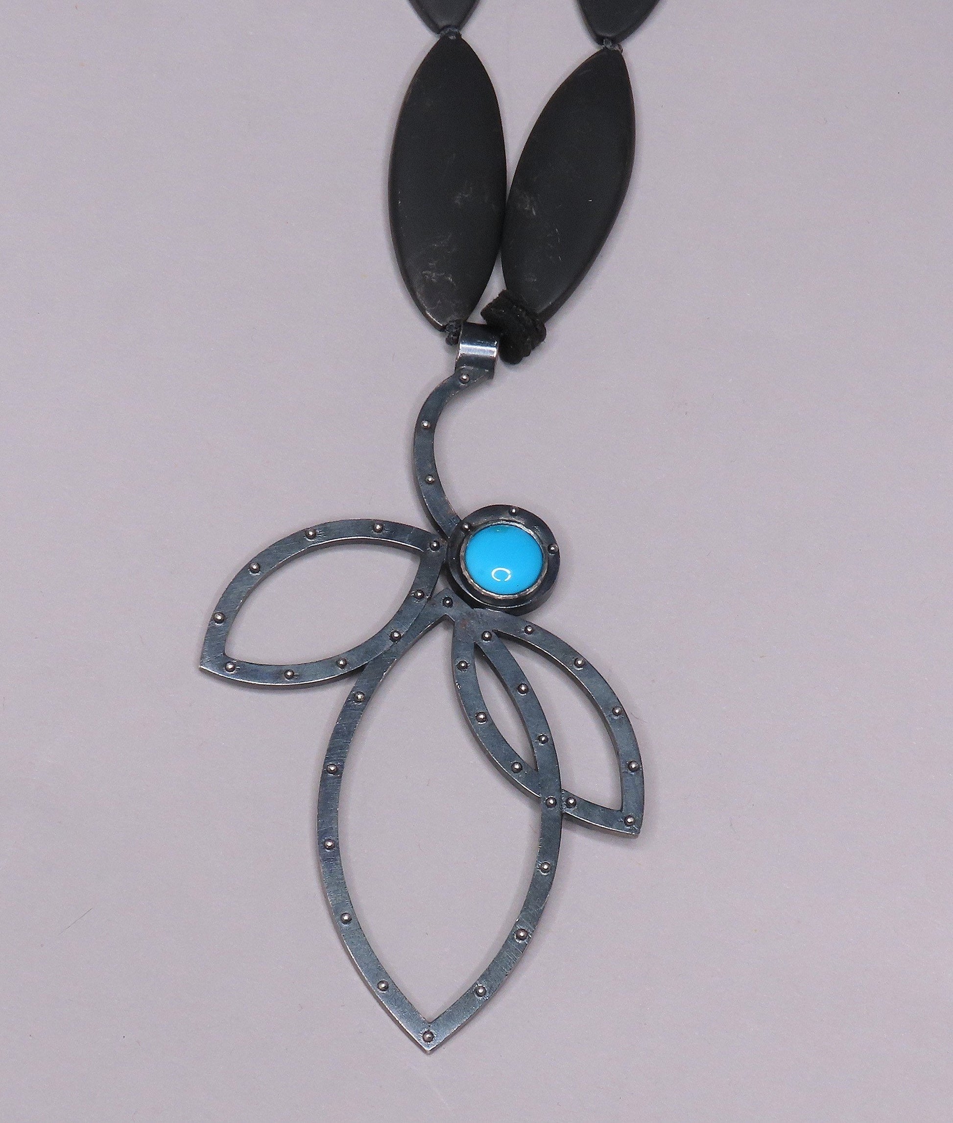 Presented is a great statement necklace with oxidized sterling silver and flat black stone football shaped beads. This piece displays a leaf-shaped pendant with a turquoise stone. The black beads are a natural stone and have a matte finish. The quality is superb.