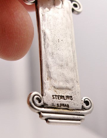 Presented is a fabulous pair of earrings shaped like the ionic columns found in ancient Greek architecture. It has onyx and what we believe to be cabochon garnet - it is hard to tell for sure since the backs are closed and not open.