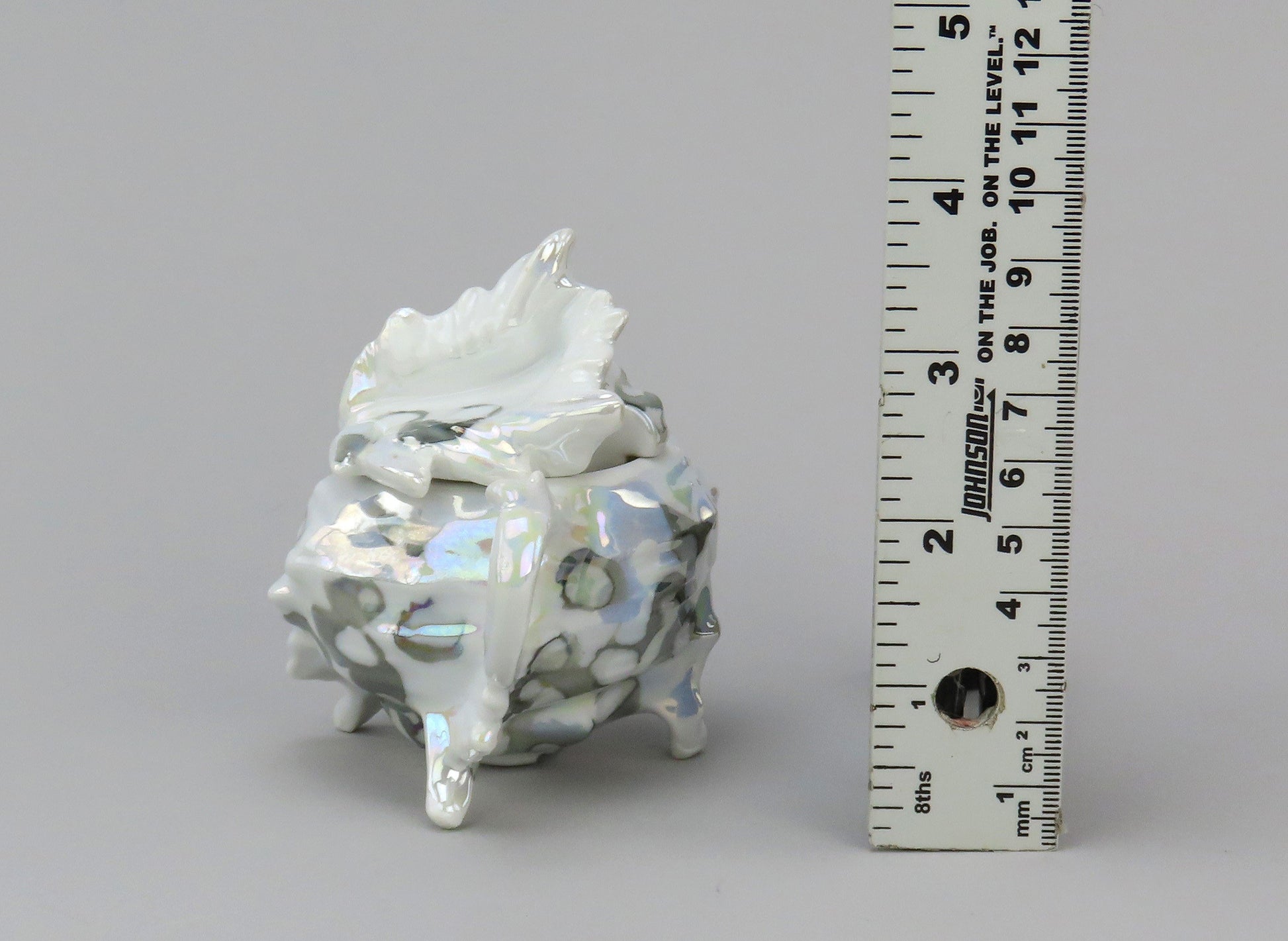 Measurements: 3 inches in diameter at widest point and 3 1/2 inches tall -kc
