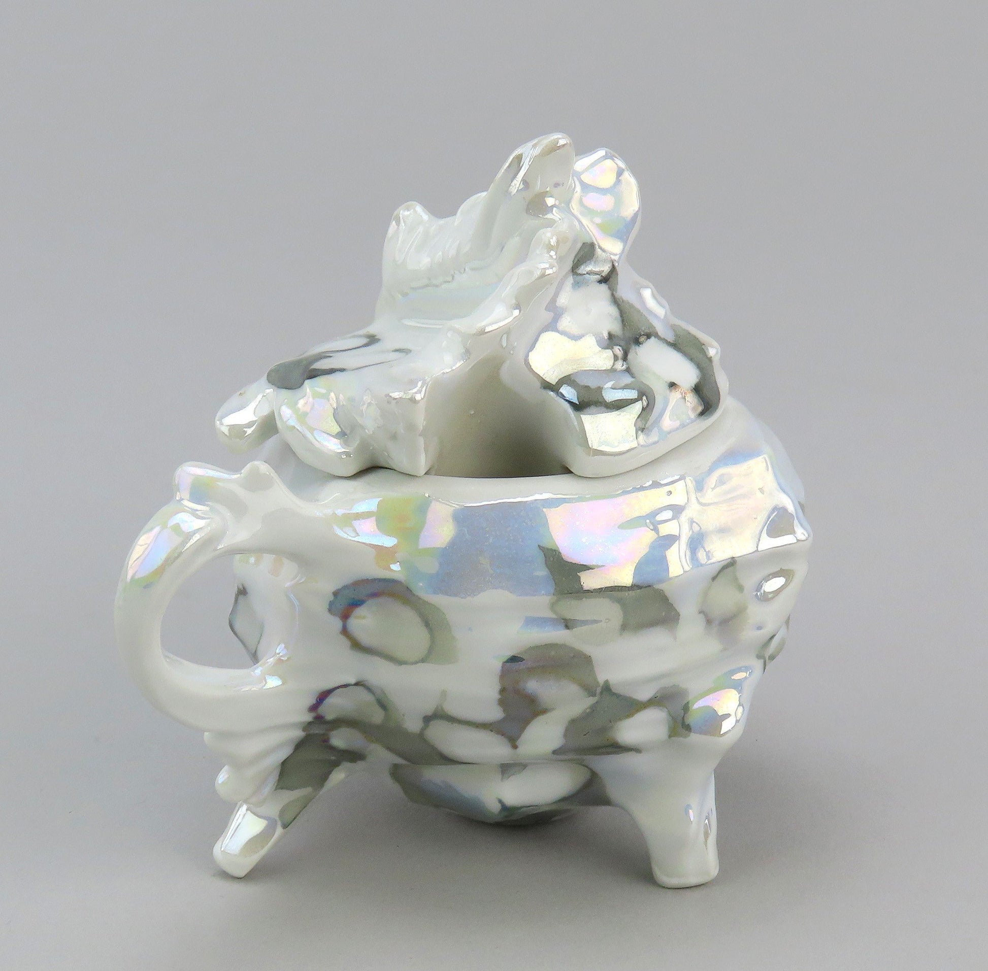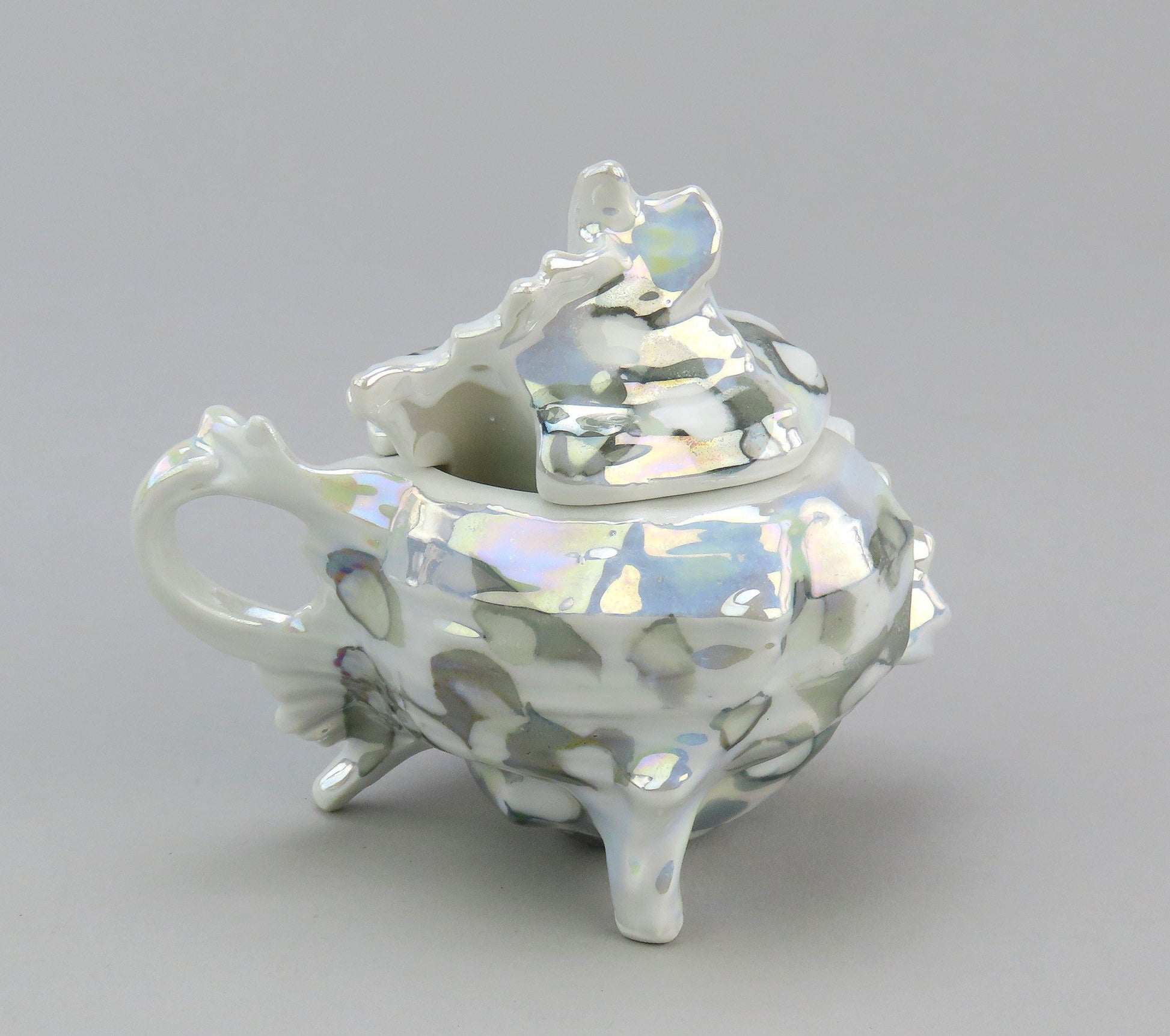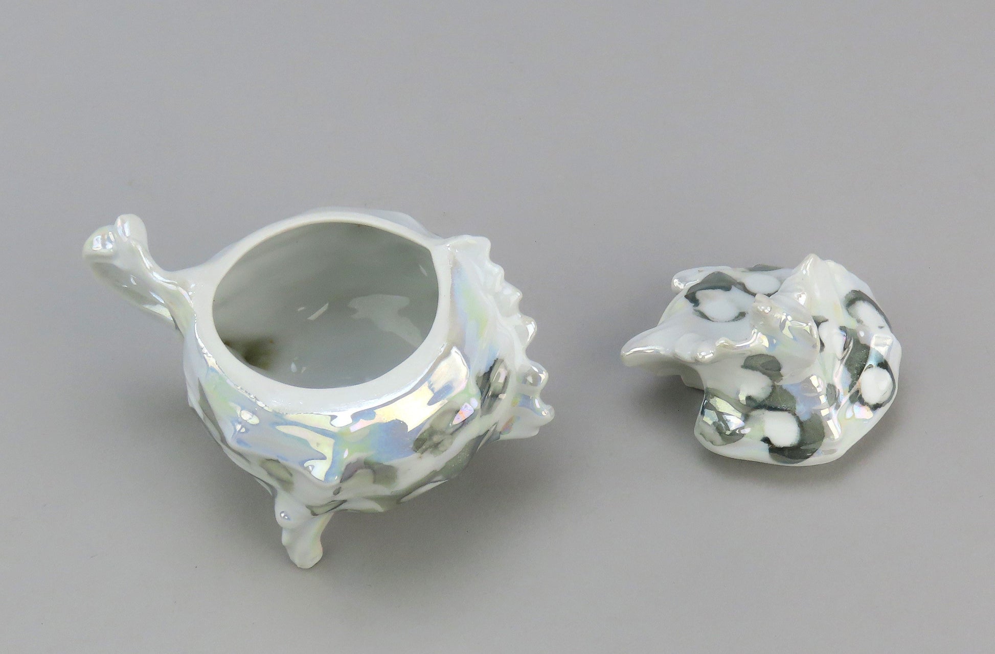Presented is a great porcelain mustard pot from Royal Bayreuth shaped like a shell. This piece is shaped like an interesting conch or whelk shell. The gray round markings mix with blues, yellows, and purples to create a ocean color scheme with an abalone style finish. There is a notch in the lid for a spoon to fit within the piece.