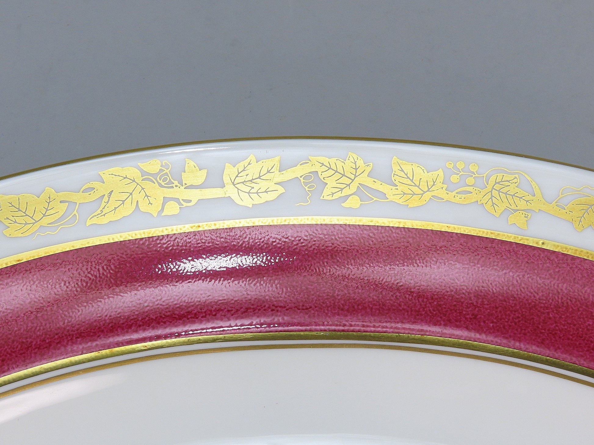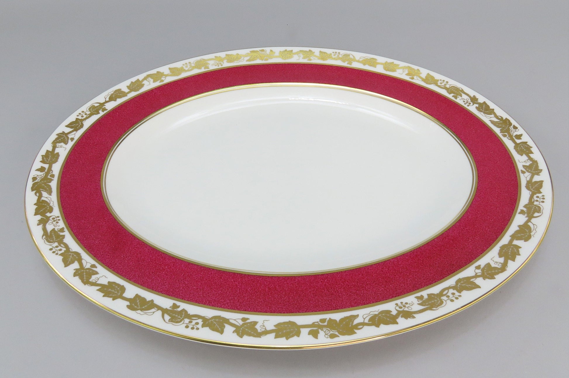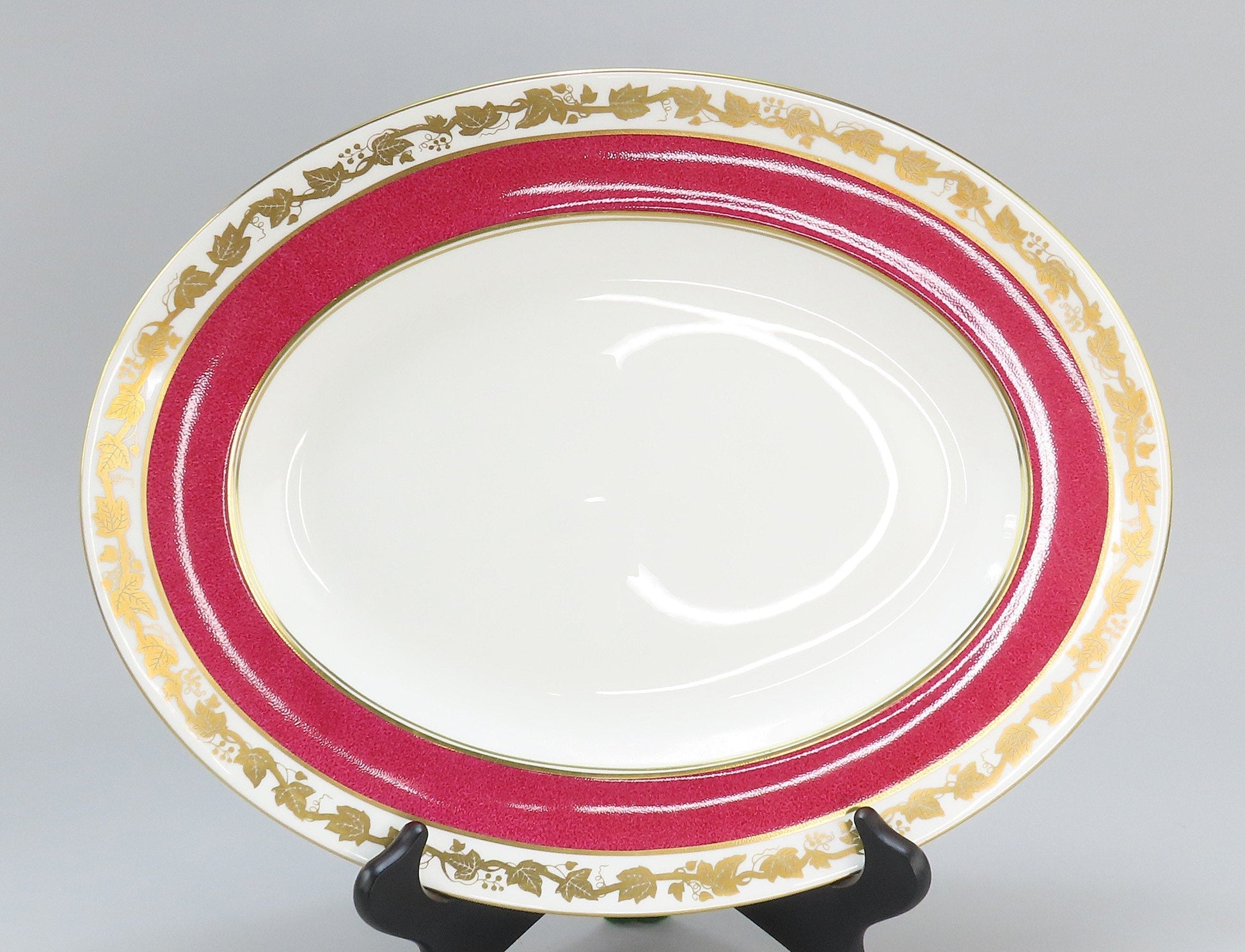 Presented is a great bone china platter from Wedgwood. This piece is in the Whitehall pattern, which was produced between 1945-1987. The pattern displays gilded grape clusters and leaves in a border around the piece. This version of Whitehall has a powder ruby band around the border as well.
