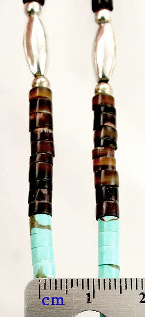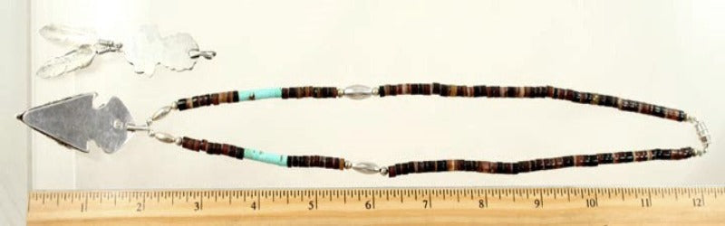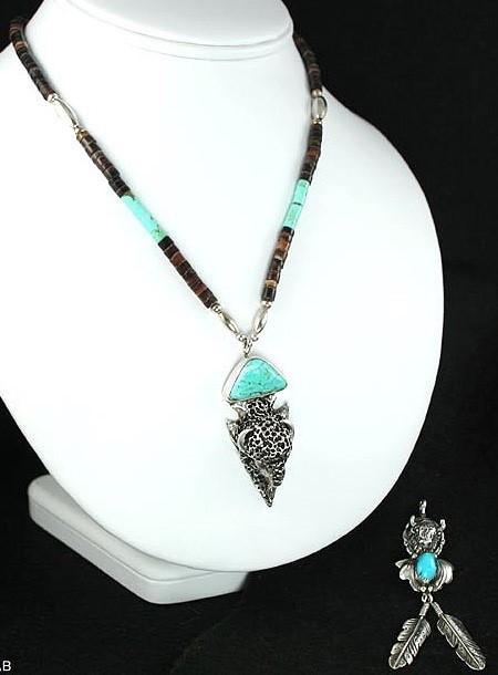 Presented is an ornate and fine quality sterling silver and beaded natural stone necklace and pendant set completely hand crafted by southwest Native Americans, most likely Navajo or Hopi. The strand is composed of horn, turquoise and sterling beads. The large pendant is set at the top with a quality turquoise stone with a great matrix above a full bodied, detailed bison's head decoration. Included with this necklace is a matching pendant, also with a bison head decoration and turquoise stone. Hanging from the bottom are two detailed silver feathers.