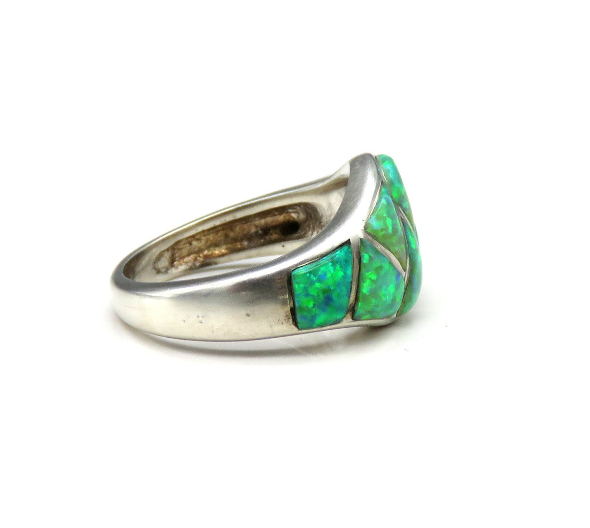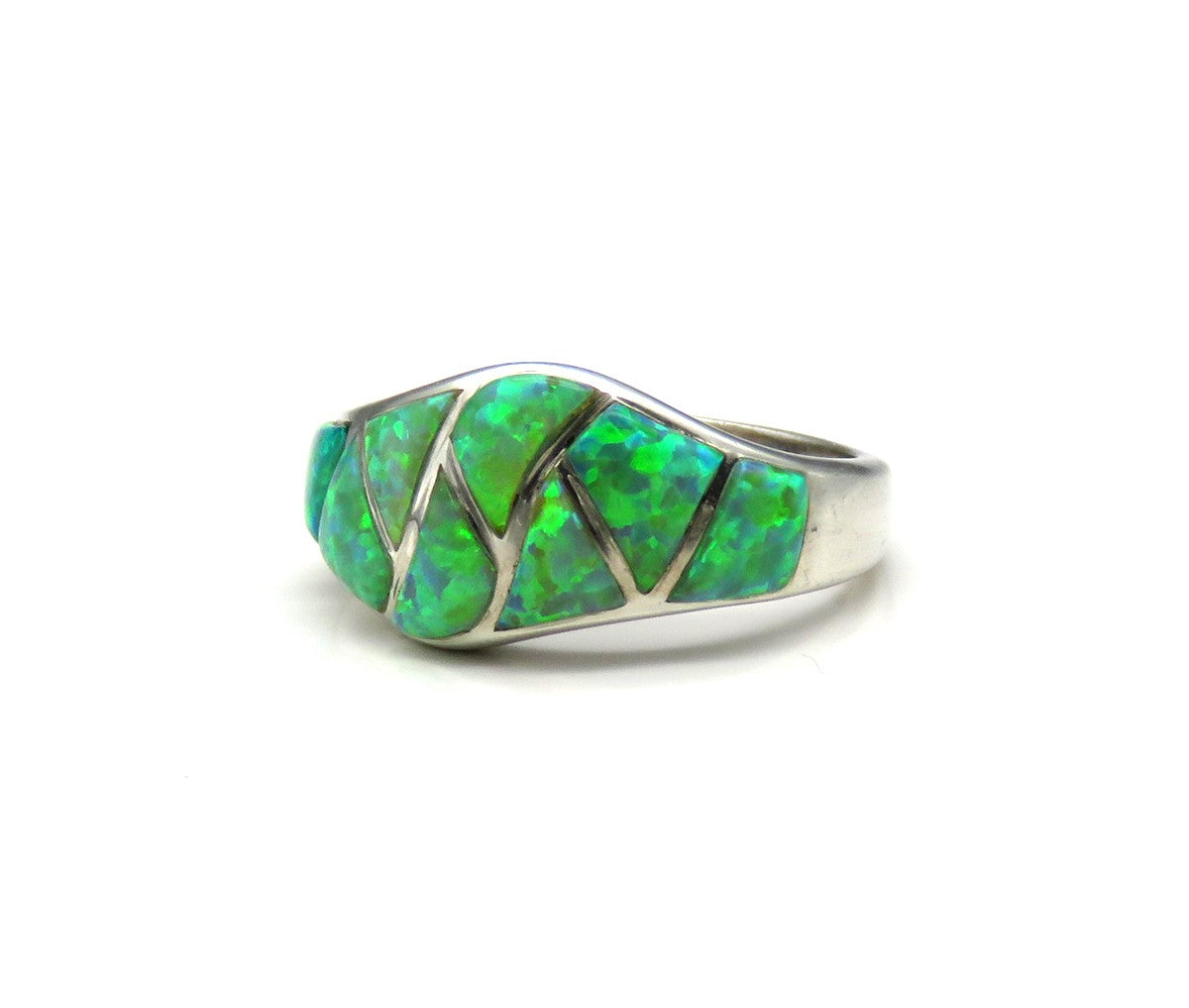 Presented is a sterling silver and opal gemstone ring made in America during the 1980s to 2010. This ring is done in a band form and the top is wider than the sides. The top is securely set with 8 pieces of lab created opal stones. The stones are very vibrant and shine with flecks of greens and blues.