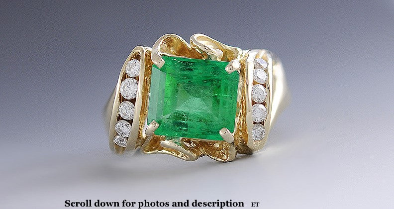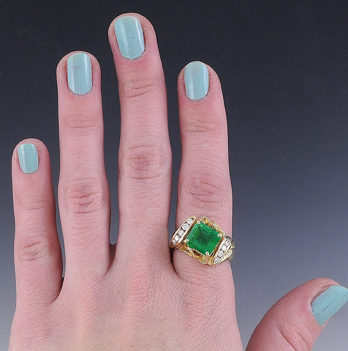 Presented is a great looking, 14 karat yellow gold, emerald and diamond ring. This is a modern piece, most likely American in origin. The emerald in the center is synthetic but you would never be able to tell this unless you were a gemstone expert! The center stone is flanked on either side with 5 modern brilliant cut diamonds that are SI clarity and H color. There is about 25 to 30 total points in diamond weight between the 10 stones. The synthetic emerald measures 9.9 by 9 by 6.7 millimeters. The ring is a size 10 1/4.