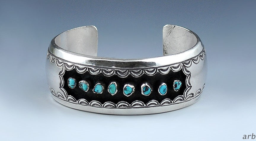 Presented is a handsome American Southwestern solid silver cuff bracelet. It has a central incised area, with a dark patina, and 8 bezel set turquoise stones.