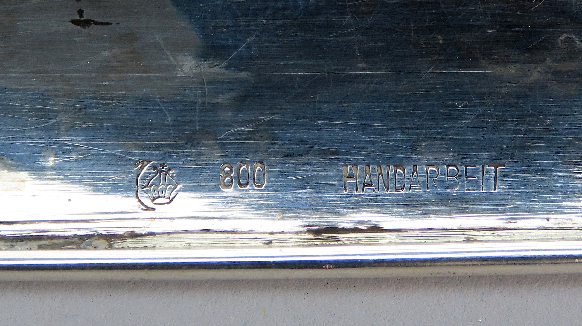 The underside is marked on the edge for .800 purity silver, the German crescent moon and crown and “handarbeit” meaning Handmade.