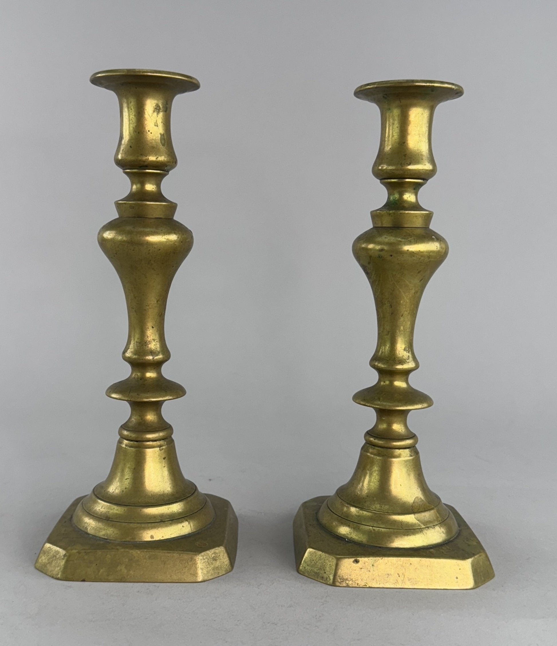 Presented is a nice pair of antique Victorian English brass candlesticks, dating to around the 1830s-1870s. These candlesticks were originally push-up style. The candlesticks have cut corner square bases and a balustroid design to the shafts. Very handsome and usable set.