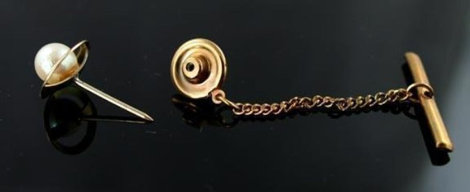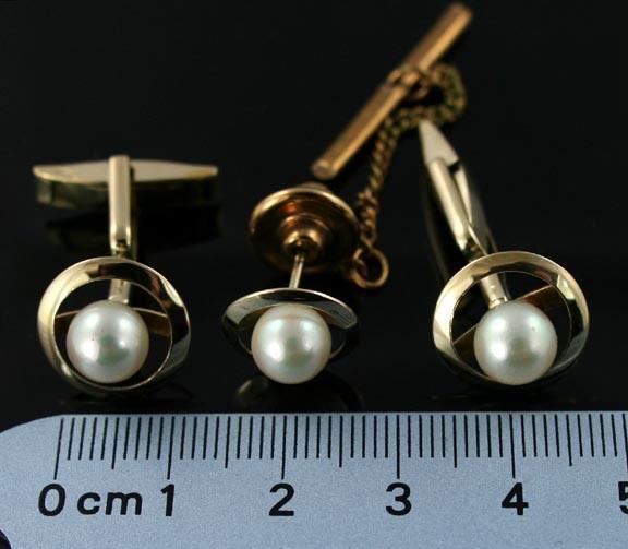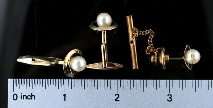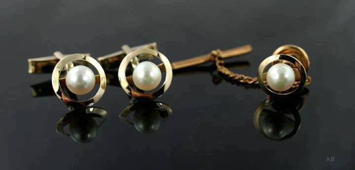 Handsome Quality 14k Yellow Gold Pearl Cufflinks & Tie Pin