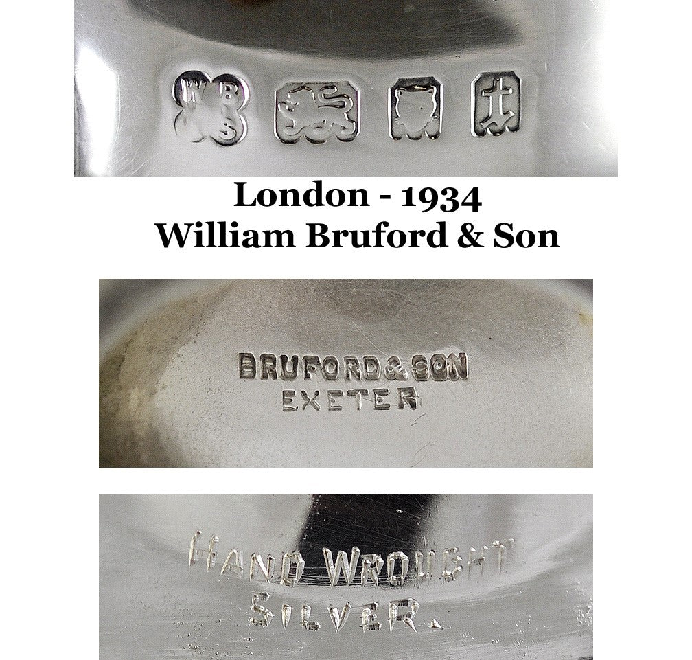 This piece is hallmarked on the back by the handle with the lion passant for sterling silver, the leopard's head for the city of London, the date letter t for 1934, and the maker's mark for William Bruford & Son. The underside is also marked with 'Bruford & Son Exeter' and 'Hand-Wrought Silver'.
