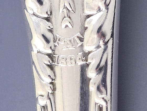 The piece is hallmarked on the stem with the maker's mark for Gorham as well as sterling and a patent date of 1894.