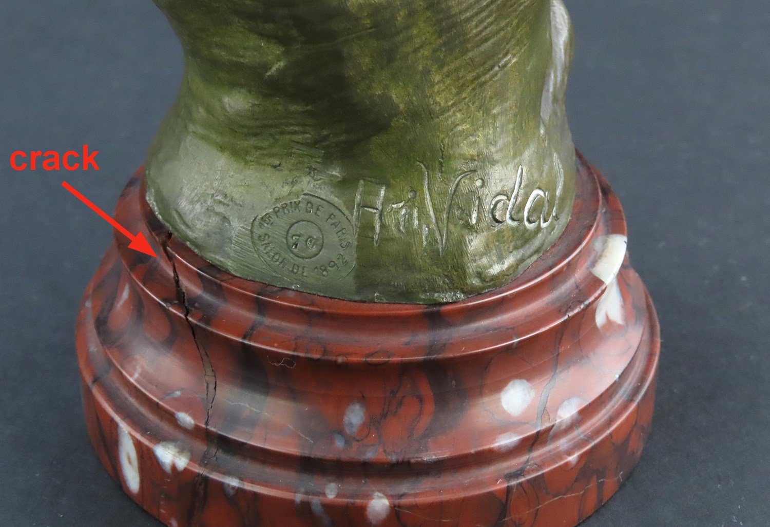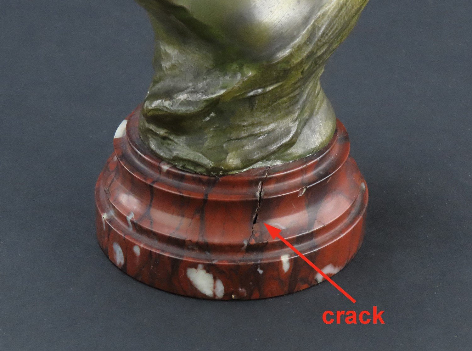 This piece is in excellent overall condition. The marble base has a crack, though this is hard to distinguish from the natural veining, and the base feels very sound, with no looseness. The bronze has no damage and the patina is in great shape.
