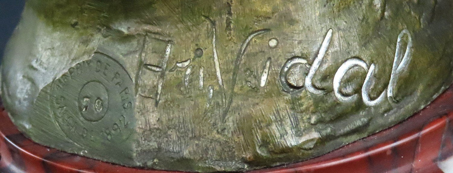 Presented is an excellent quality French bronze bust of a young woman, signed for Henri Vidal. The bronze depicts a young woman with her hair up in a dynamic style, on a richly veined red marble base. The bronze is quite expressive and very well done; the woman has a charmingly uplifted expression, very skillfully rendered. This piece won Vidal the 1st Prize at the Paris Salon of 1892, and is stamped as such, near the base, next to the signature.