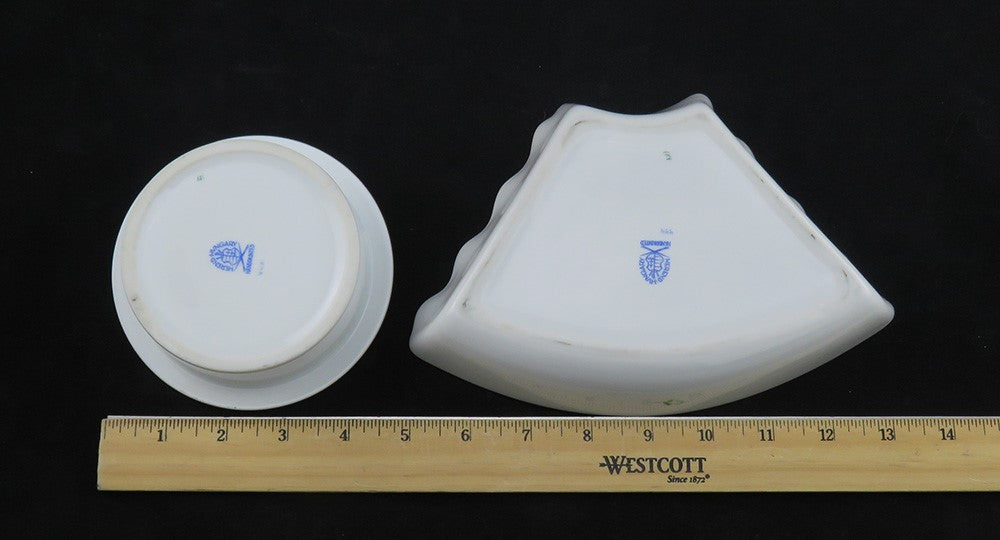 This set is in excellent overall condition. Some of the wedge shaped dishes are painted with a lighter or darker color green. This can be seen in the photos.